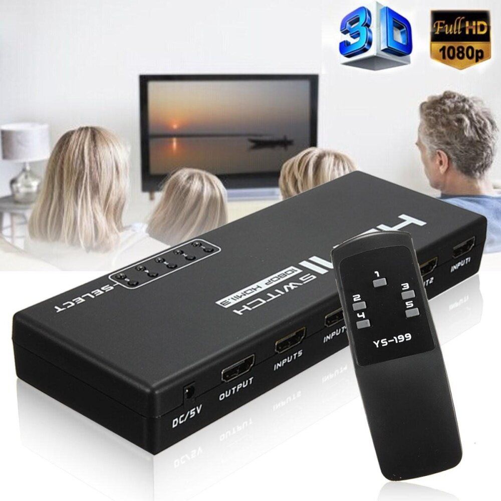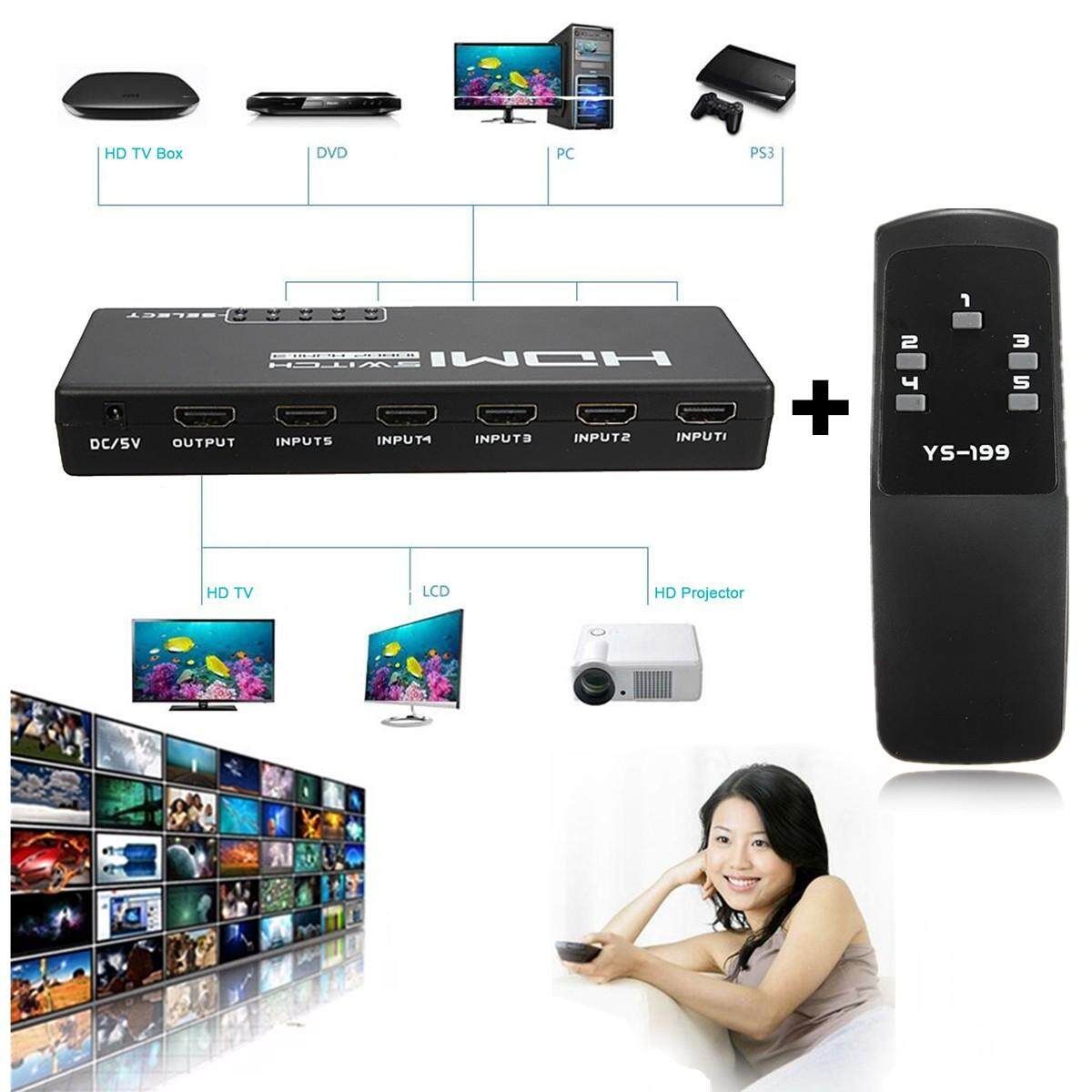 1.This 5 port HDMI switcher (also called an HDMI switch or HDMI selector) receives signals from up to 5 HDMI devices, and outputs to an HDTV/, with your desired HD source selected by a simple remote control.