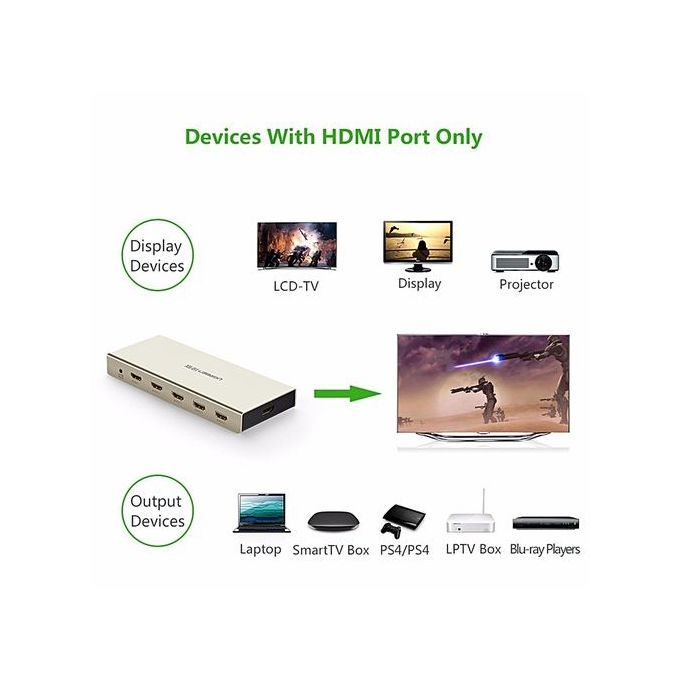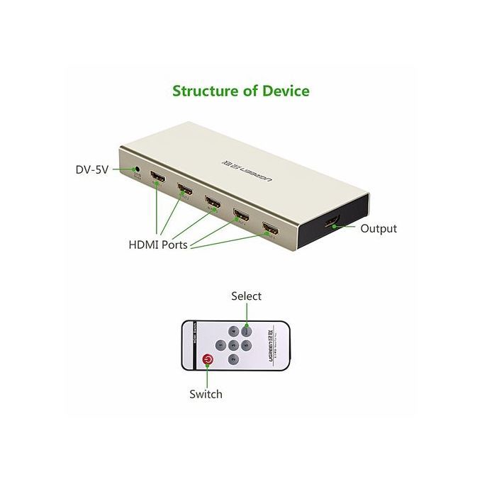 UGREEN 5 Ports HDMI Switcher enables you to manage multiple high resolution HDMI source devices connect to single HDMI TV or display with easy remote control to switch between the HDMI sources;