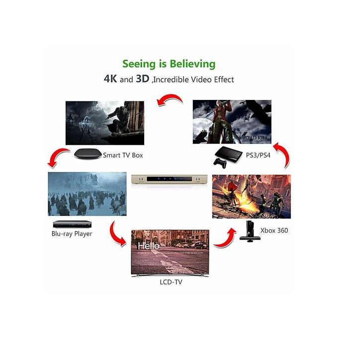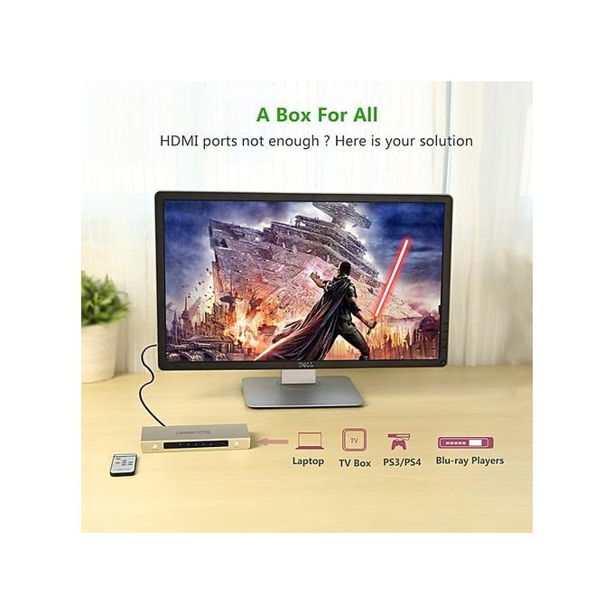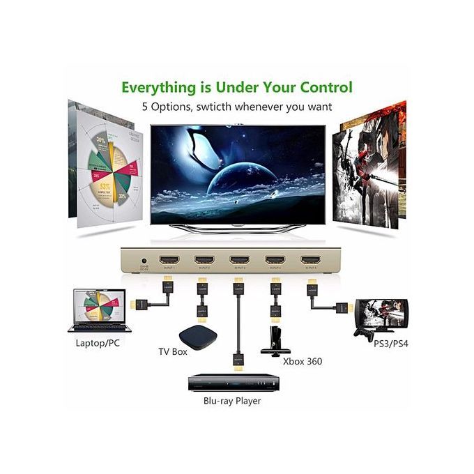 The HDMI switch box allows you to input 5 HDMI source device to 1 TV/Display/Monitor;