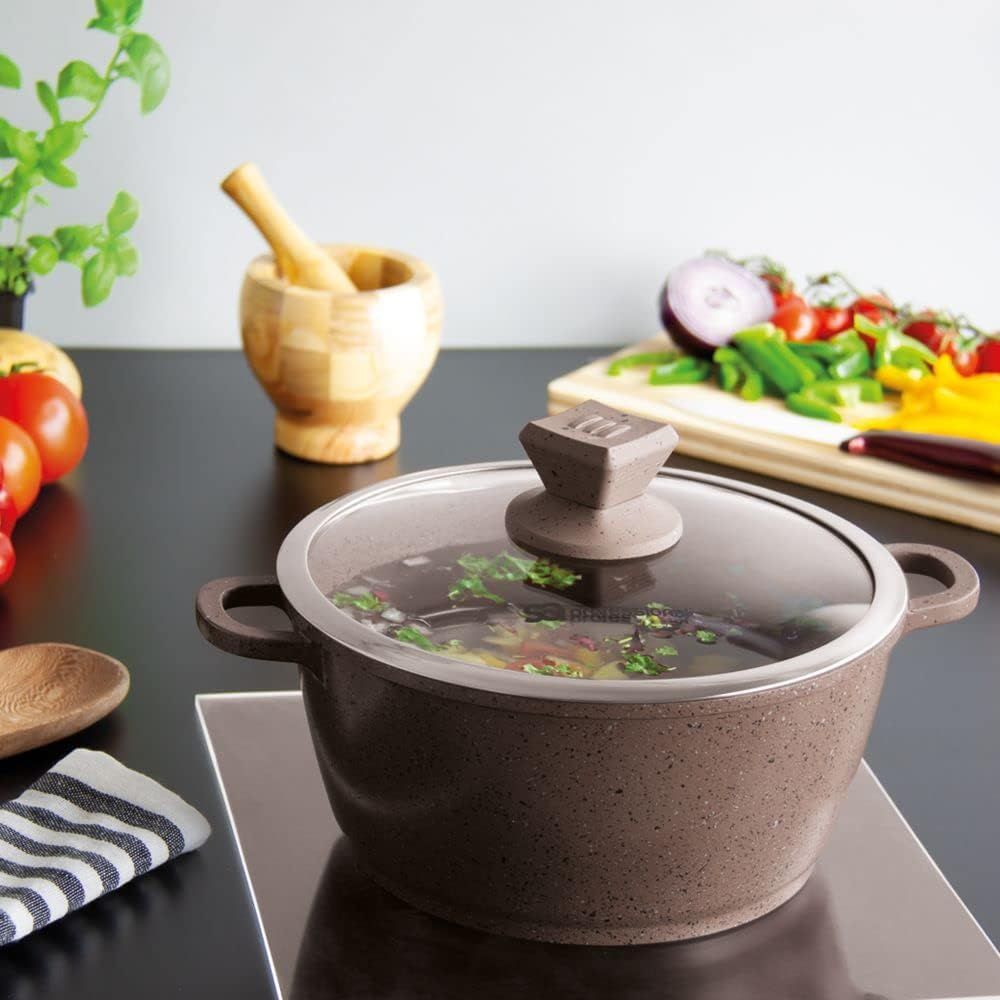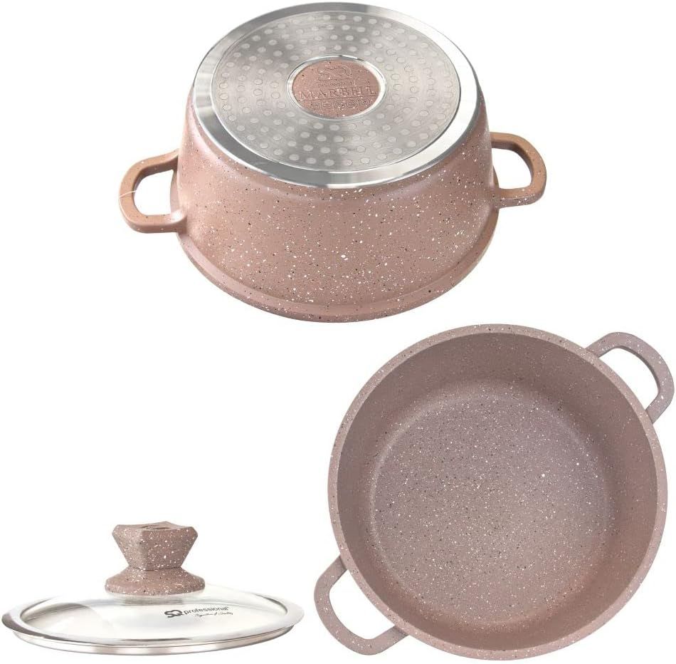 Professional Quality CookwareWith the round, SQ Professional five-piece stockpot set, from the Nea Marbell Range, you can make healthy, home cooked recipes to a professional standard, every time. Suitable for a wide variety of dishes, these circular stockpots bring a unique style and quality to your kitchen.