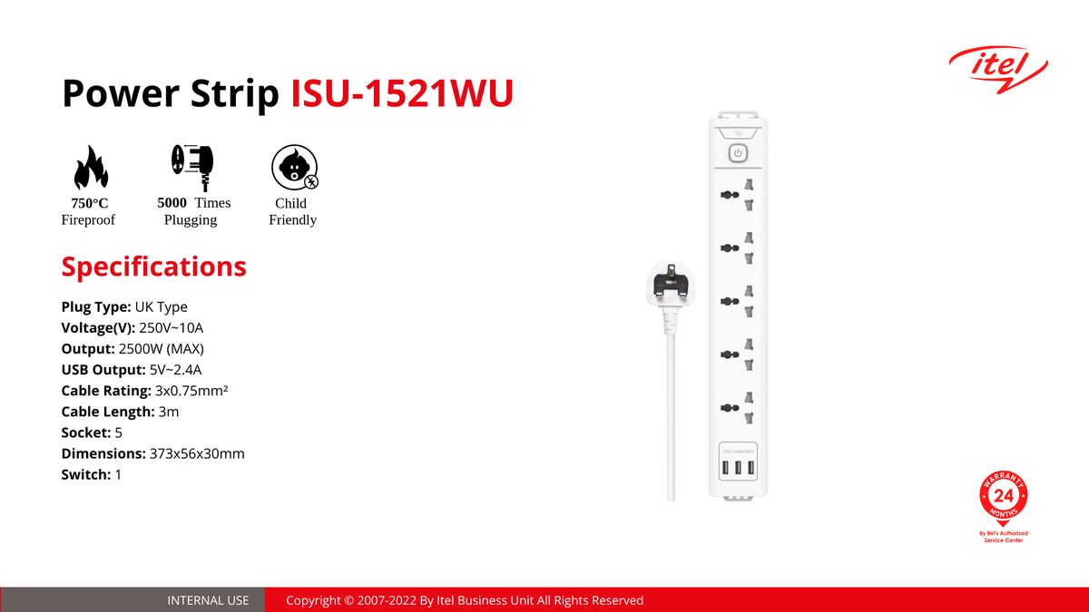 Itel ISU-1521WU Extension Box was designed to suit your everyday need. This extension socket has 5 sockets and 3 USB ports where you can plug in any of your home appliances. The sockets are suitable for all plug types. You can plug your laptops, TVs, air conditioners, phones, satellite decoders, blenders, food processors, juice makers, etc. Its 2500 maximum wattage makes this possible.