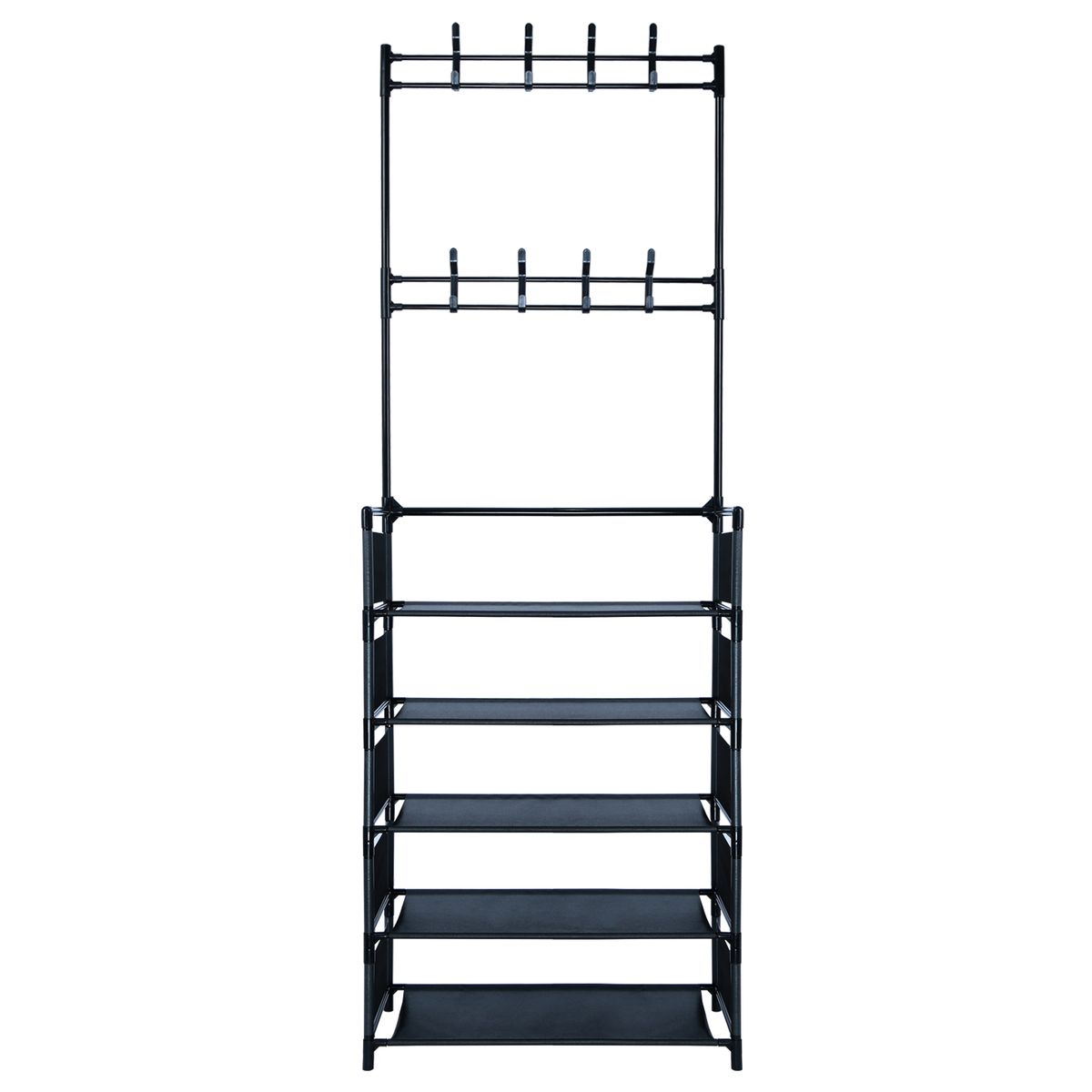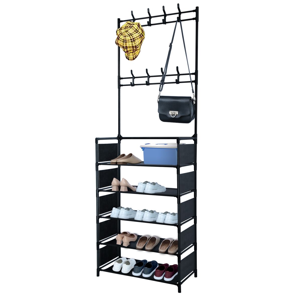 MULTIFUNCTONAL DESIGN: This freestanding hall tree boasts its 3 in 1 design, acting as a caps rack, shoes rack and organizer for small s. 5 tiers rack for shoes, boxes, folded clothes and 16 hooks are available to hang the clothes and daily essentials such as caps, scarves, umbrellas, bags, towels, keys, etc.