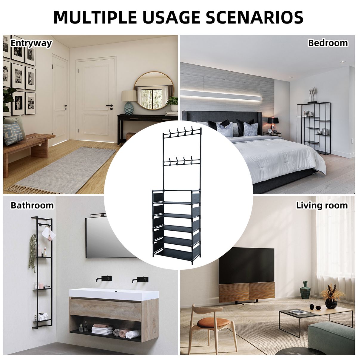 - 【MULTIPLE USAGE SCENARIOS】: The rack well matches any other decorations at your home with its classic black color, ideal for entryway, bathroom, bedroom, living room, hallway and dressing room. It is designed for your comfortable and convenient lifestyle.