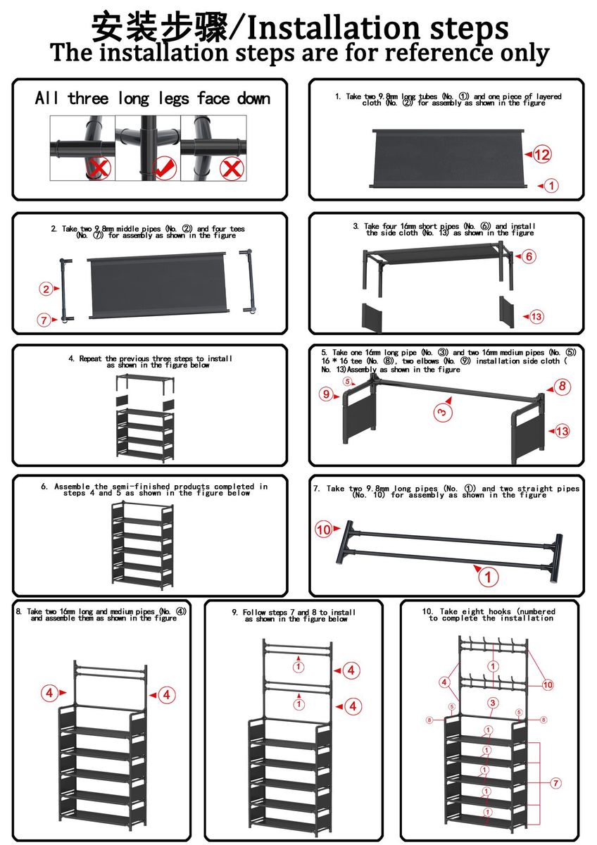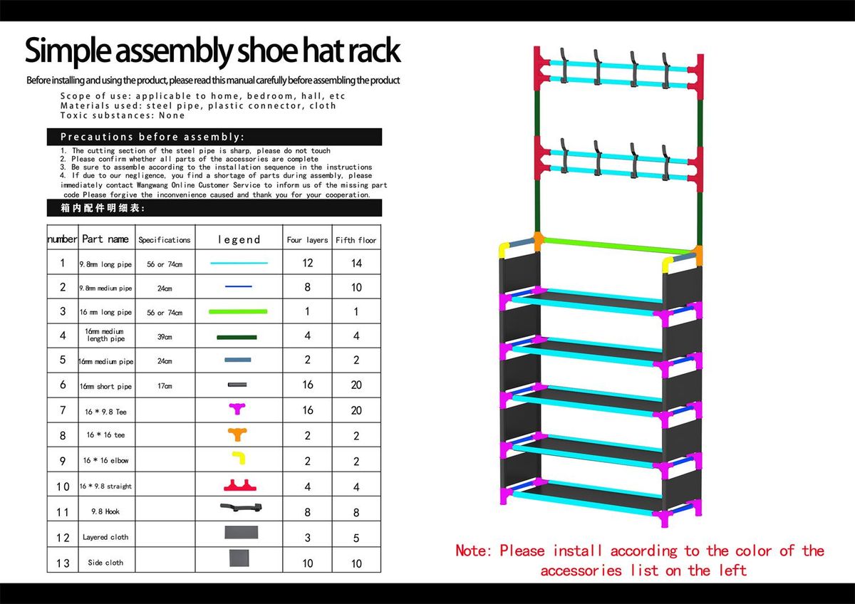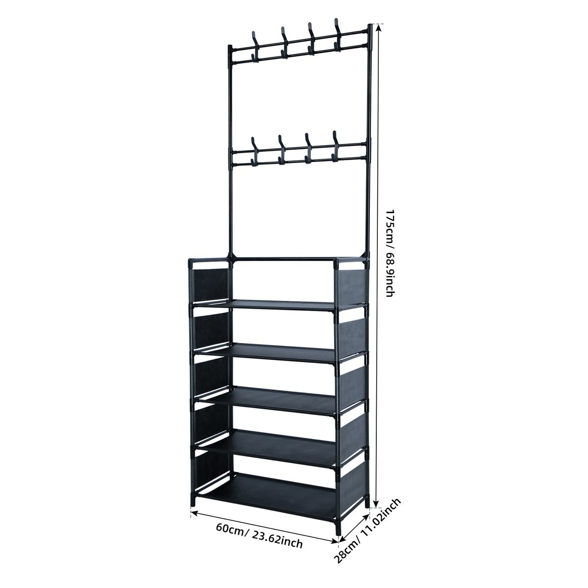 With a combined design for shoes organizer and rack of cap and clothes, this free standing organizer provides flexible storage solution for indoor hallway, living room, bedroom, entryway, dressing room, office or student dormitory. Thickening carbon steel and high-quality connector are adopted for stability and durability. Featuring 5 tiers of shoe racks and 16 hanger hooks, it is an optimal choice for space saving and better organization.