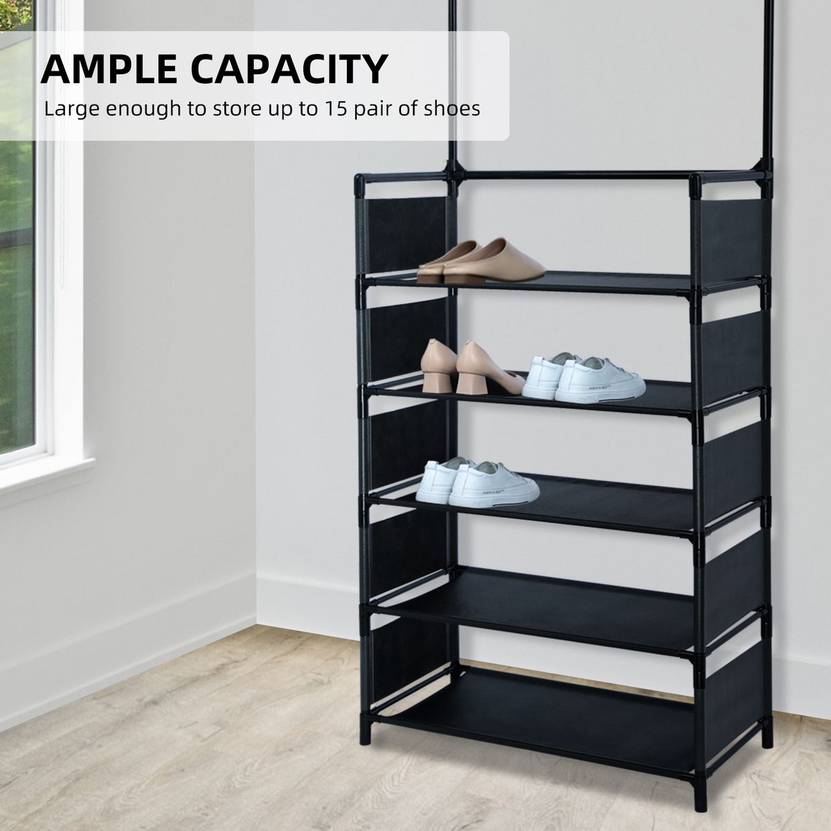 AMPLE CAPACITY: Equipped with 5 tiers shoe racks and 16 hooks, the shoe rack organizer provides a compact, space-saving solution for storing your footwear and can be used to hold other necessities as well. This adjustable shoe rack is large enough to store up to 15 pair of shoes, and you can remove one layer to put boots or other large items.