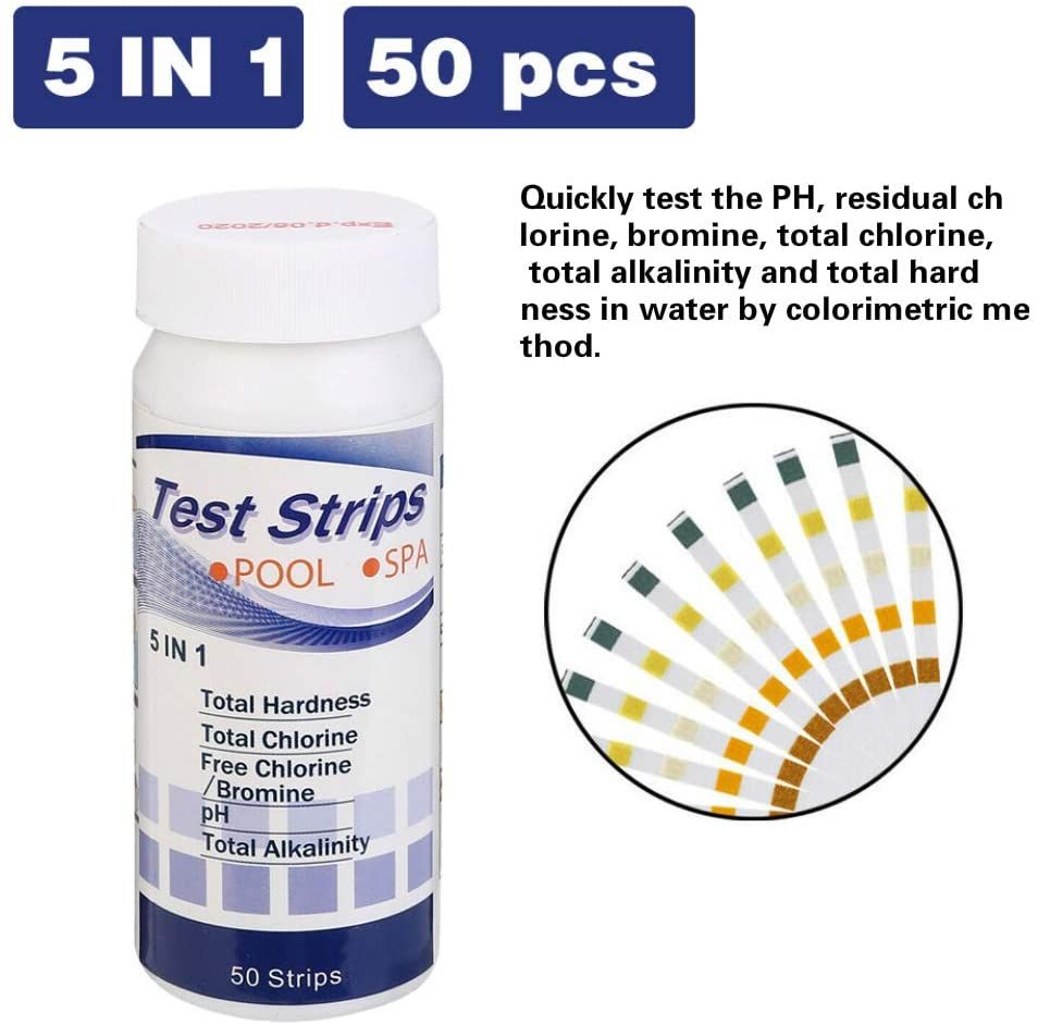 1. 5 in 1 Pool and Spa water quality test strips.Tests for Free Chlorine, Free Bromine, pH, Total Alkalinity, Total Hardne and Total chlorine.
