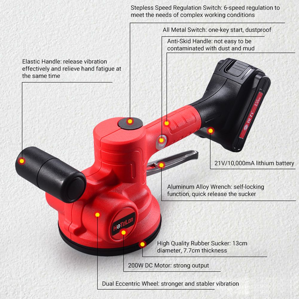 [Adjustable Stepless Speed Regulation] 6 gears of vibrating frequency (500~12000rpm/min) can be adjusted according to tile size and plastering thickness; dual eccentric wheel amp; strong motor, stronger and stabler for higher working efficiency.
