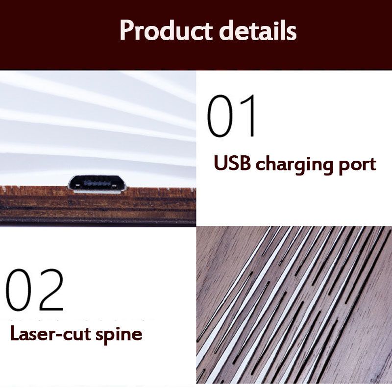 White Maple Wood Grain Book Light Creative Flip Book Light USB Rechargeable Night LightFeature:1.【Aesthetics and Practicality】For reading on bed or desk at home or in hotel. Also can be used as home decoration.2. 【Portability】A5 book size, easy to carry with books or small objects in your bag.3. 【Friendly and Safety Design】With a USB cable provided and a 2000mA rechargeable ion built-in; Charge time 3-4 hours, lamp works 5-6 hours. High quality LED beads, flicker-free and anti-glare light without strobes and radiation, it can keep your eyes away from exhaustion. Made of safe, the surface of the light gives a normal temperature, it's safe for touching.4. 【A Best Gift】A best gift that signifies hope and happiness to you, your family and your home. Can used as Brithday, Christmas, or any memorable occasions gifts.5. 【Compact And Portable】 Outdoor lighting, lightweight and portable, can be rotated 360 °, evenly illuminated.Description:Light source type: led lightVoltage: ≤36V (V)Shade material: paperSwitch type: InductiveLight temperature: 3000KCharging time: 3-4hEndurance: 5.5 (h)Material: woodenColor: White MaplePower: 5WSize: 4.7 * 11 * 2.5CM, 12 * 9 * 2.5, 10 * 8 * 2.5CMWeight: 220g, 170G, 120GBrightness: 500LMLighting: white light, warm white light, warm yellow lightPower supply: USB poweredMain scope of application: Home premises, corridors, leisure and entertainment venues, exhibition halls, corridors, hotel lobby, hotel roomsPack Include:1X Book light
