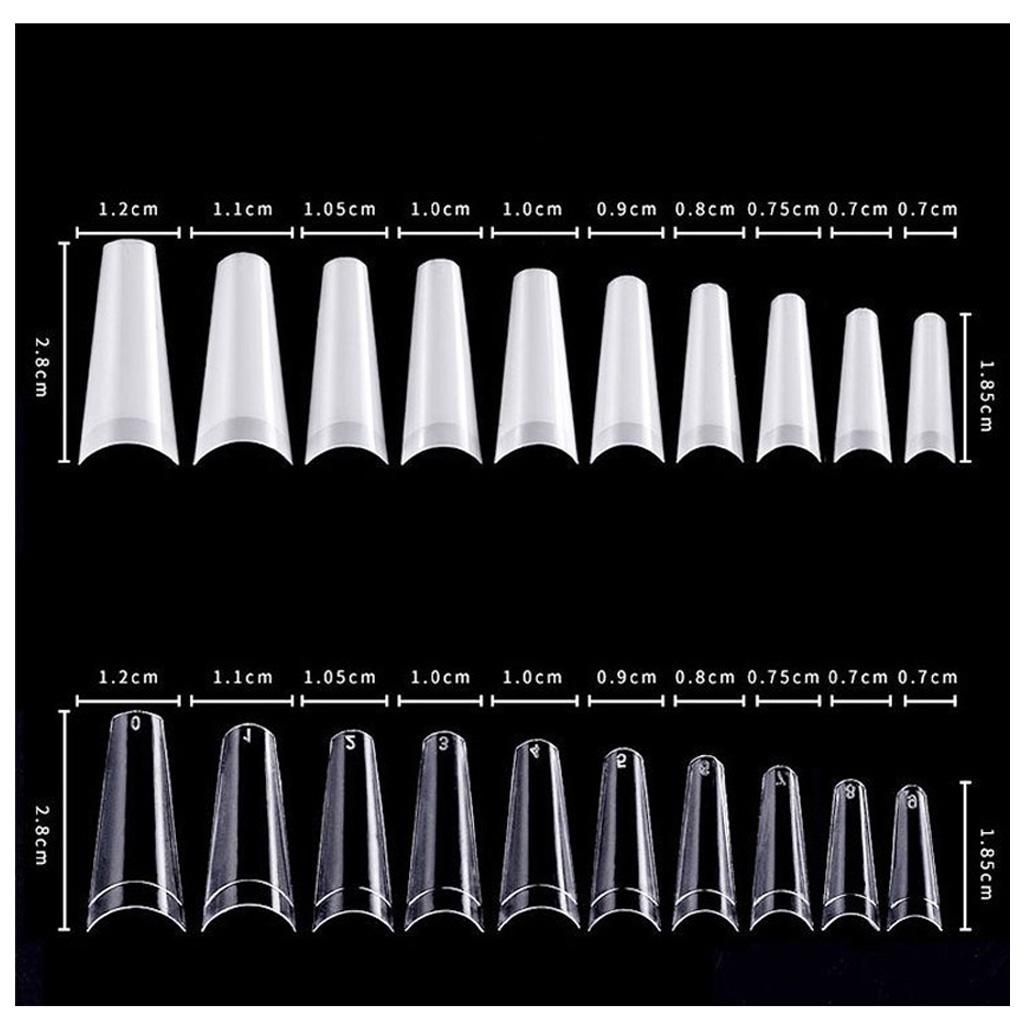 Type: False NailMaterial:ABSColor: Natural / ClearWeight: approx. 55gShape: C CurveSize: 500pcs false nails offers 10 different sizes with 50 nails of each sizeQuantity:500PCS/bag