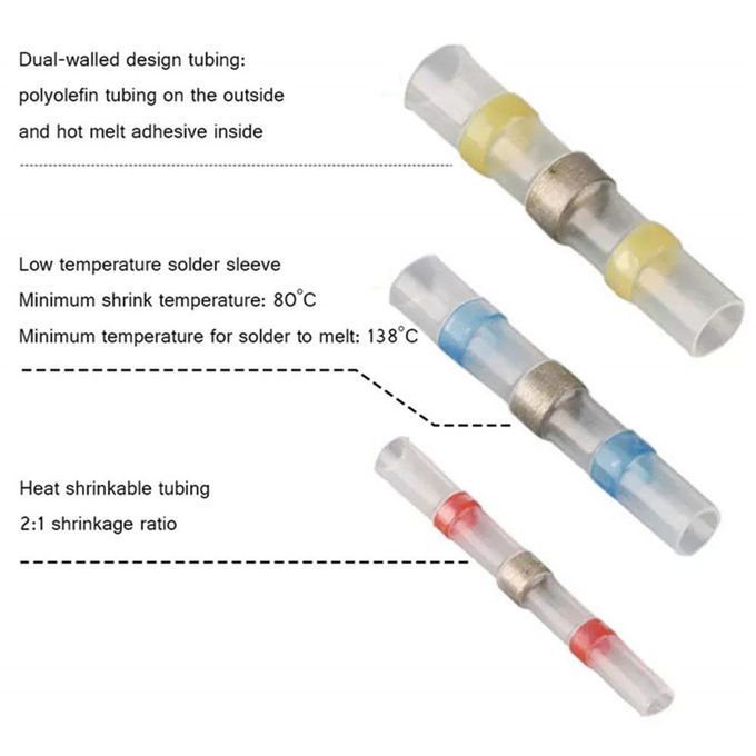 Wiring Solder Kit. Waterproof and dustproof, made of heat shrinkable material,which immediately shrinks and wraps the wire after encountering high temperature 1250 degrees.
