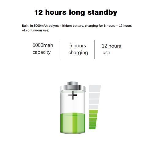 Built-in 5000mAh rechargeable lithium battery, fully charged for 12 hours of continuous use.