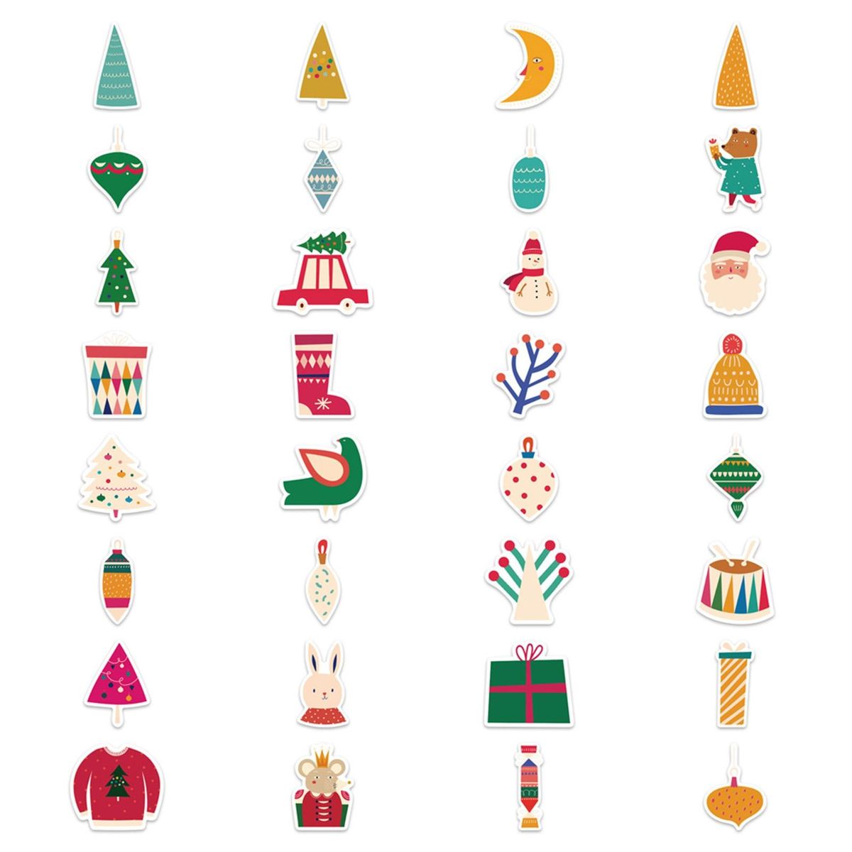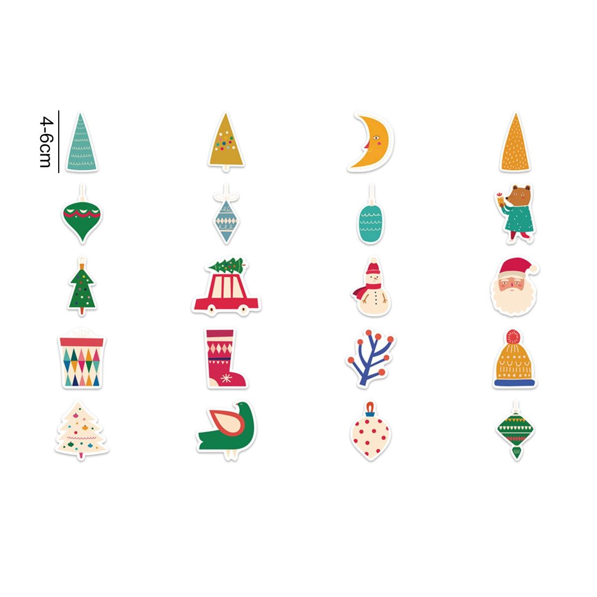 These Christmas cartoon stickers with vibrant colors, various cute Santa Claus and Christmas tree patterns, which can be applied to water bottles, laptops, helmets, notebooks, cell phones, suitcases, skateboards, motorcycles, cars, scrapbooks, refrigerators, guitars, bumpers, walls, and more.