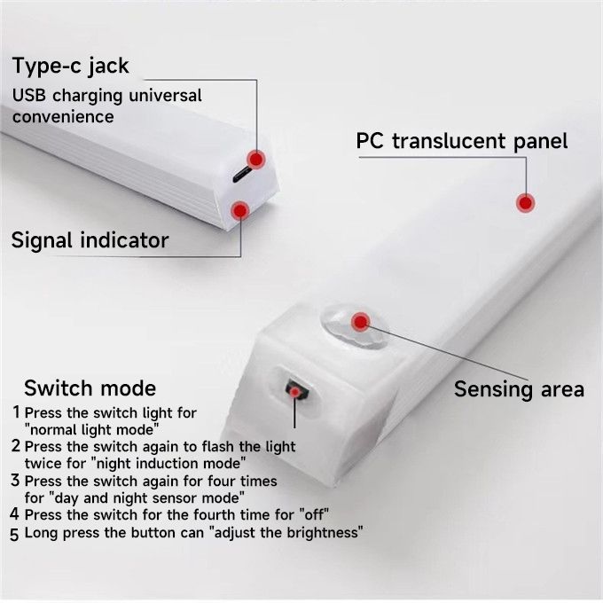 Tips: 1. In AUTO mode, it needs to be used in a dark environment for the sensor device to detect sensitively. 2. The sensor is located in the center of the lamp, the middle sensor is more sensitive, the further away from the center, the weaker the sensitivity Features: 1. This hand wave sensor switch light is the perfect solution for kitchen, toilet in the places where you don't want to the switch when your hands are wet. Just wave your hand on the switch to activate the light (the working distance is 2-5cm), wave again to turn off. 2.It is perfect for bedroom, kitchen and closet, wardrobe, cupboard, stairs 3. Lightweight and easy installation: you can install it anywhere you want with adhesive strips or screws. Please note: It will automatically turn off during the day! The sensor mode only works in the dark with motion detection! Paketliste: