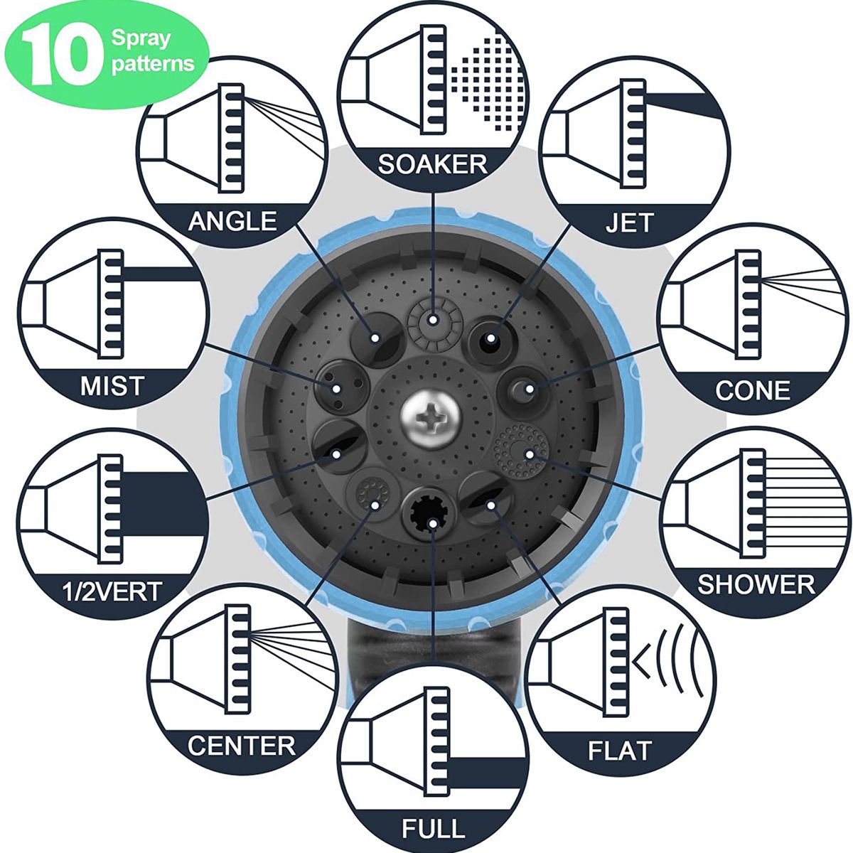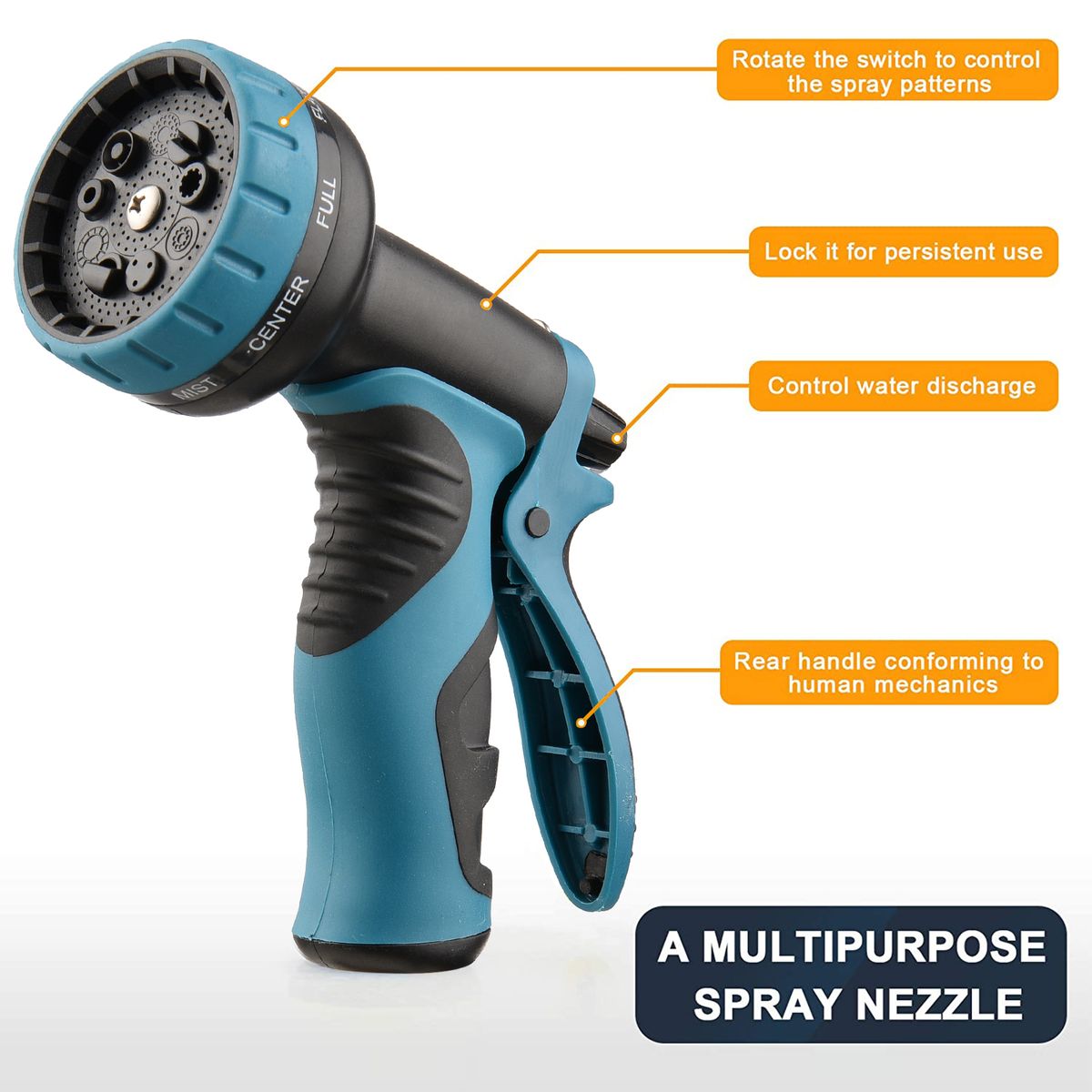 9 Functional Safety Nozzle: Garden hose nozzle with 9 functions for more choices. The rubberized outer coating is non-slip and comfortable. Rotating bezel for easy choosing kind of spray. Buckle stent for uninterrupted use.