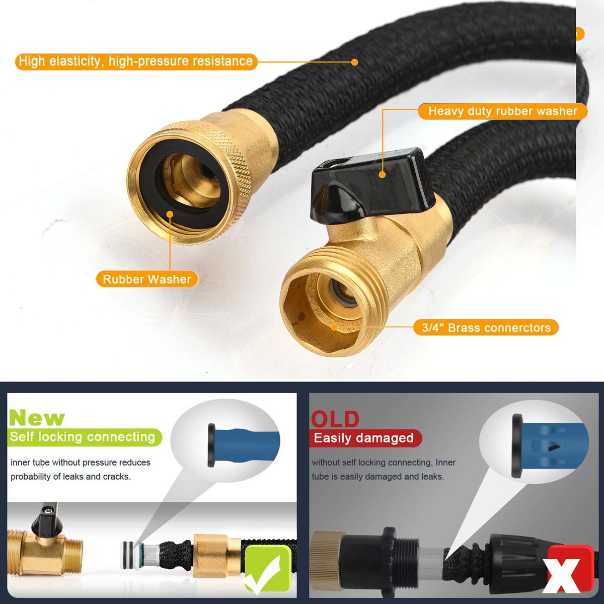 Solid 3/4in Brass Connectors: The 50ft expandable hose comes with solid 3/4 inches brass connectors, they will not rust, leak, or crack. With the correct adapter, you can connect to the product you want to connect. If the thread size of the connected product is 3/4 inch, the hose can be connected without an additional adapter.