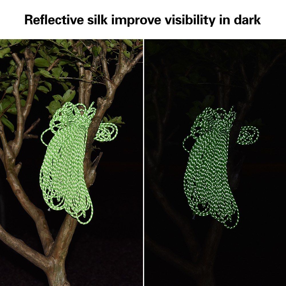 Reflective rope when light shines on it, which makes it convenient when set up camping tent, awning and canopy in dark.