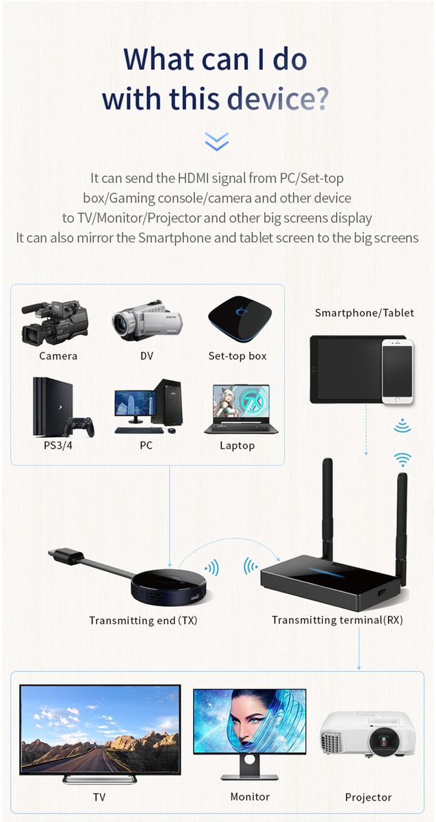 Dear friends,Note Pls: this product has two kinds of shells,we will ly send,they are the same function, pls no worry. If you choose the option of "A set of TX RX" it is (one Transmitter + one Receiver + acceories) If you choose the option of "Only 1 Transmitter" it is (one Transmitter + one power cable ) if you choose the option of "Only 1 Receiver", it is one receiver and acceories ,and your phone should have screen mirroring or sharing function. but nexflix etc. hdcp apps cannot work If you want 1,2,3 or 4 computers wirelely switch to onedisplay, you can buy up to 1,2,3or 4 Transmitters + one Receiver This product only supports many-to-one,it does not support one-to-many. The Receiver can be used alone,while the transmitter cannot be used alone This product supports up to 50 meters no obstruction one-to-one transmiion (20m is recommended) ; if only the receiver,advise use within 5m; if need to use through the wall,the distance is hard to say (because i t depends on many factors,such as the distance,obstacles quantity, matierals,thickne etc. all will affect the using effect, If used through obstacles, the effect of use depends on the actual situation. ) It is Chinese booting picture but it has nothing with your using,because it is plug and play and high quty ,buy with confidence ! in default ,it comes without retail box,if need,pls contact us first!