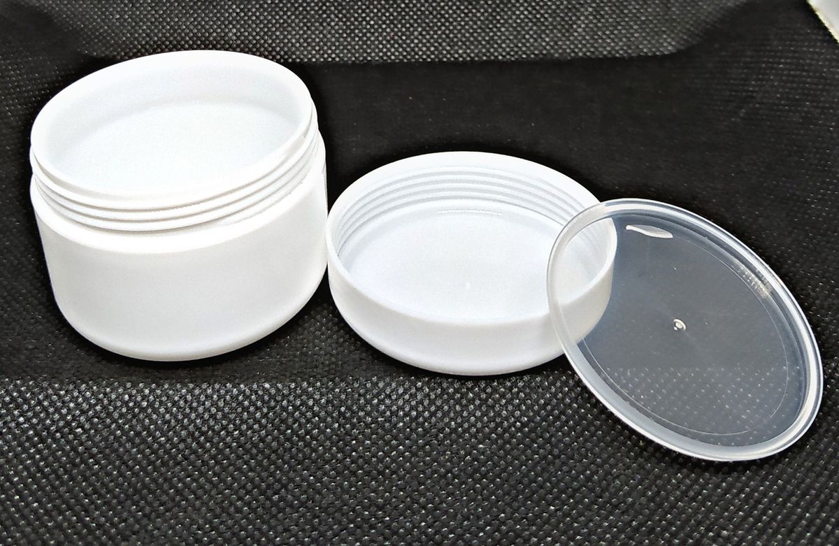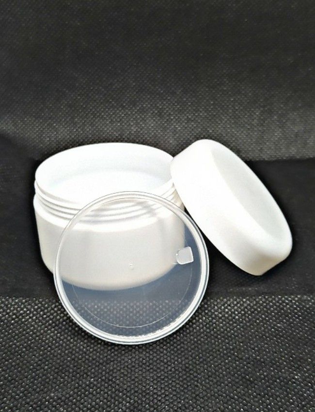 50ML plastic cosmetic jars, with inner liners and dome lids to help prevent leaking.