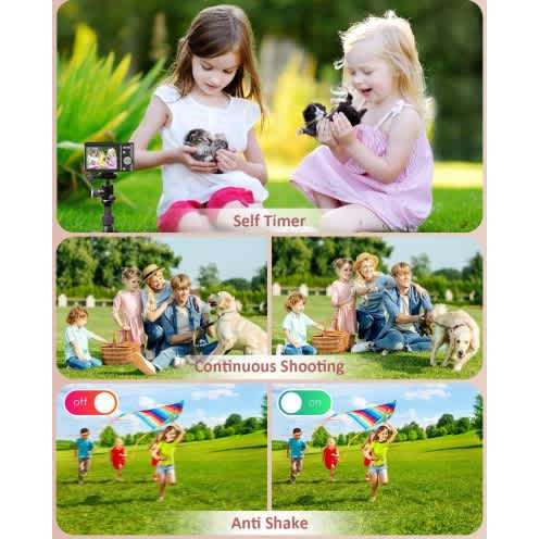 Multi-functions Compact Camera: This camera with 2.7K UHD video resolution,50MP (max) picture pixel,8MP CMOS image sensor,2.8 inch LCD screen,16X digital zoom,pause function,built-in fill light,anti-shaking,continuous shooting,face detect,smile capture,self-timer,internal microphone and speaker(record sound videos),USB 2.0.This is a cost-effective entry-level ordinary camera,easy to operate,ideal gift for kids,adult,seniors,students,beginners.