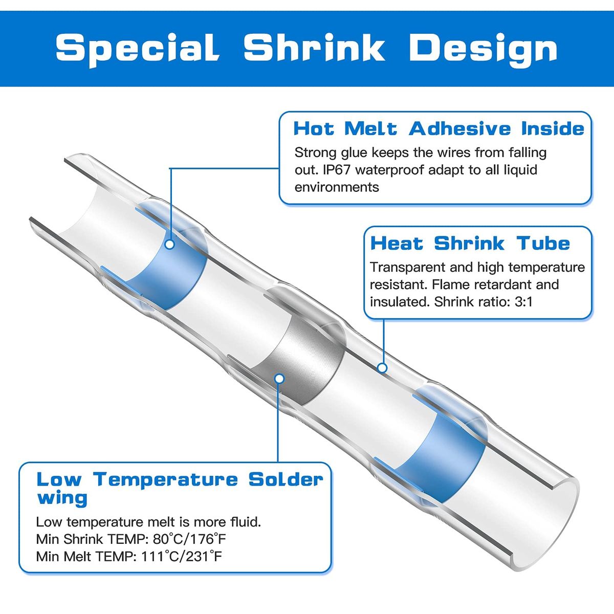 Feature:- Transparent sleeve provides precise inspection when strip and insert wires inside.Color-coded tubing makes it easy to identify the right size of the connector for every application.- Simply position the two stripped wires into the solder sleeve and use hot gun to apply heat to finish the connection.Don't need to crimp,and the insulation tubing will shrink down,shrinking ratio: 3:1,creating a waterproof seal.- Polyolefin tubing outside and hot melt adhesive inside would effectively improve the waterproof performance of these solder connectors.- Due to high waterproof, these Solder Seal Wire Connectors are commonly preferred in automotive sector as well as marine sector,can also used for vehicle, home or scientific wiring projects.