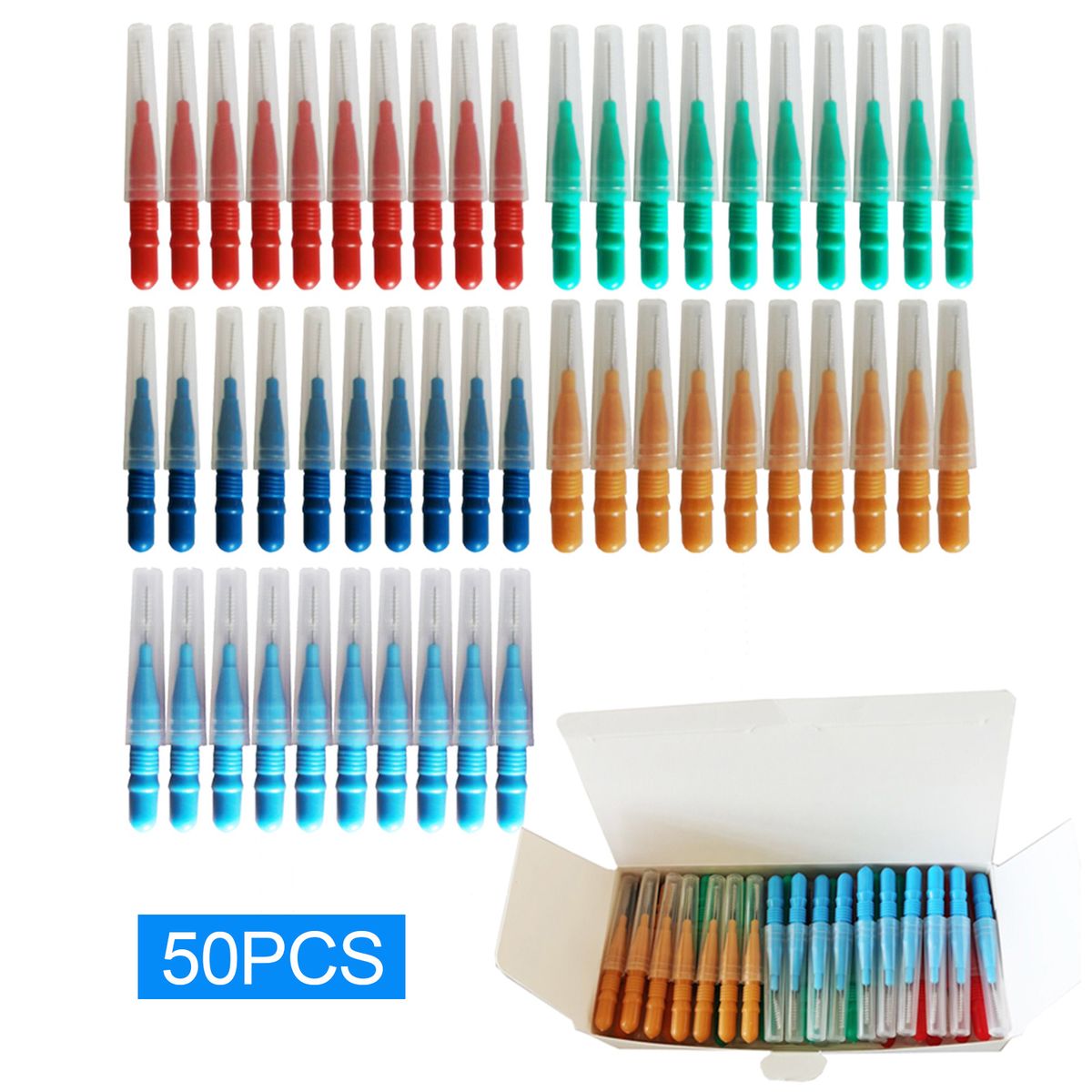 50PCS Interdental brushes in mixed colors, enough quantity and different styles fit for family use.