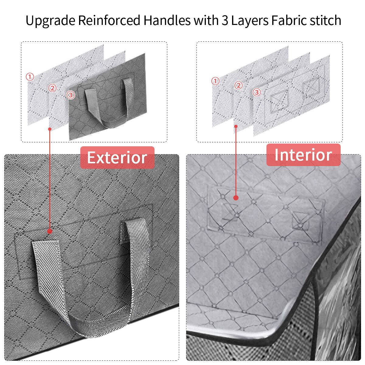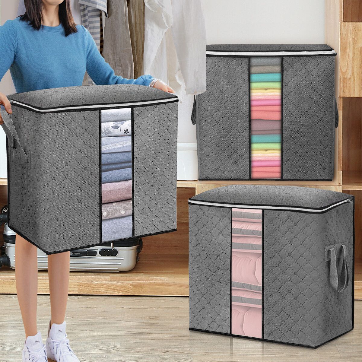 50x35x50cm 4 Pack Large Capacity Clothes Storage Bag Organizer Reinforced Handle Thick Fabric Sturdy Zipper Clear Window 80L Storage Boxes for Comforters Blankets Bedding Foldable