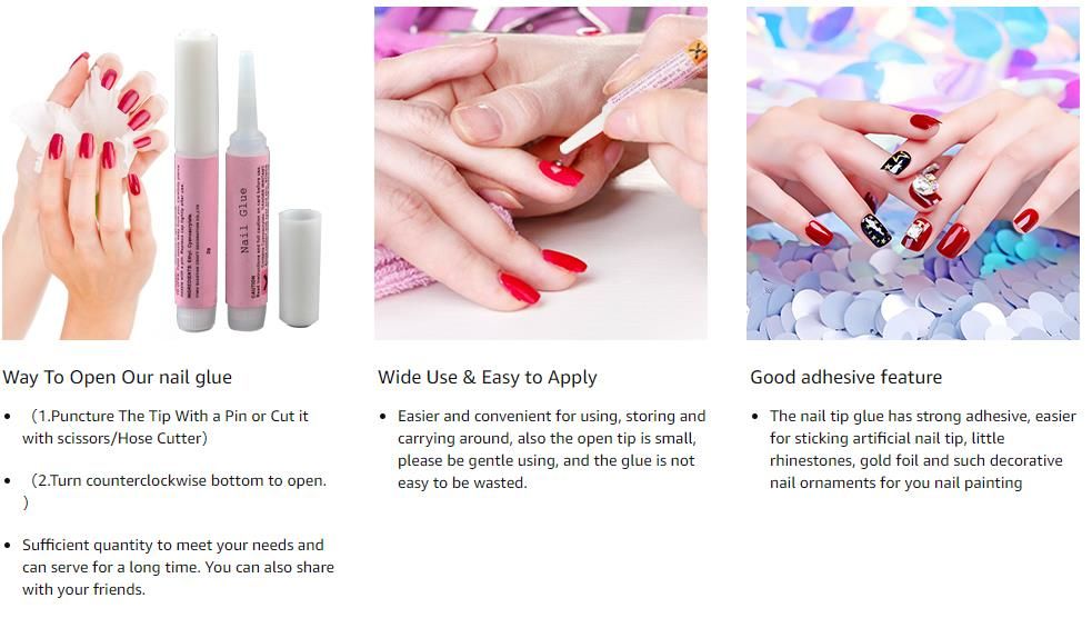 Nail Tip Glue Adhesive Bond For Acrylic Nails Tips Durable, moisture-resistant and fast drying adhesion High quality nail glue for a secure fit of the artificial nails Small bottle design for easy portability. Strong adhesive nail glue will make sure your false nails never falls off.