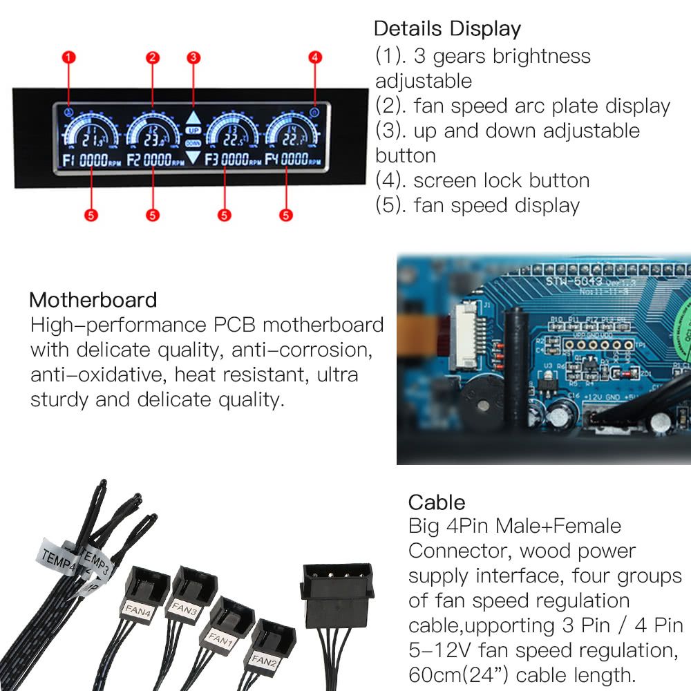 CNC milled aluminum magnesium alloy panel which endures tear and wear, ensuring sturdy and steady performance. Full resistive touch screen features VFD180 deg;HD resolution liquid crystal display. Four groups of fans can be controlled individually and it can real time monitoring four groups of temperature,crystal clear and easy operation. Fan stuck detection and overheat alarm provide a safe and reliable PC working environment.