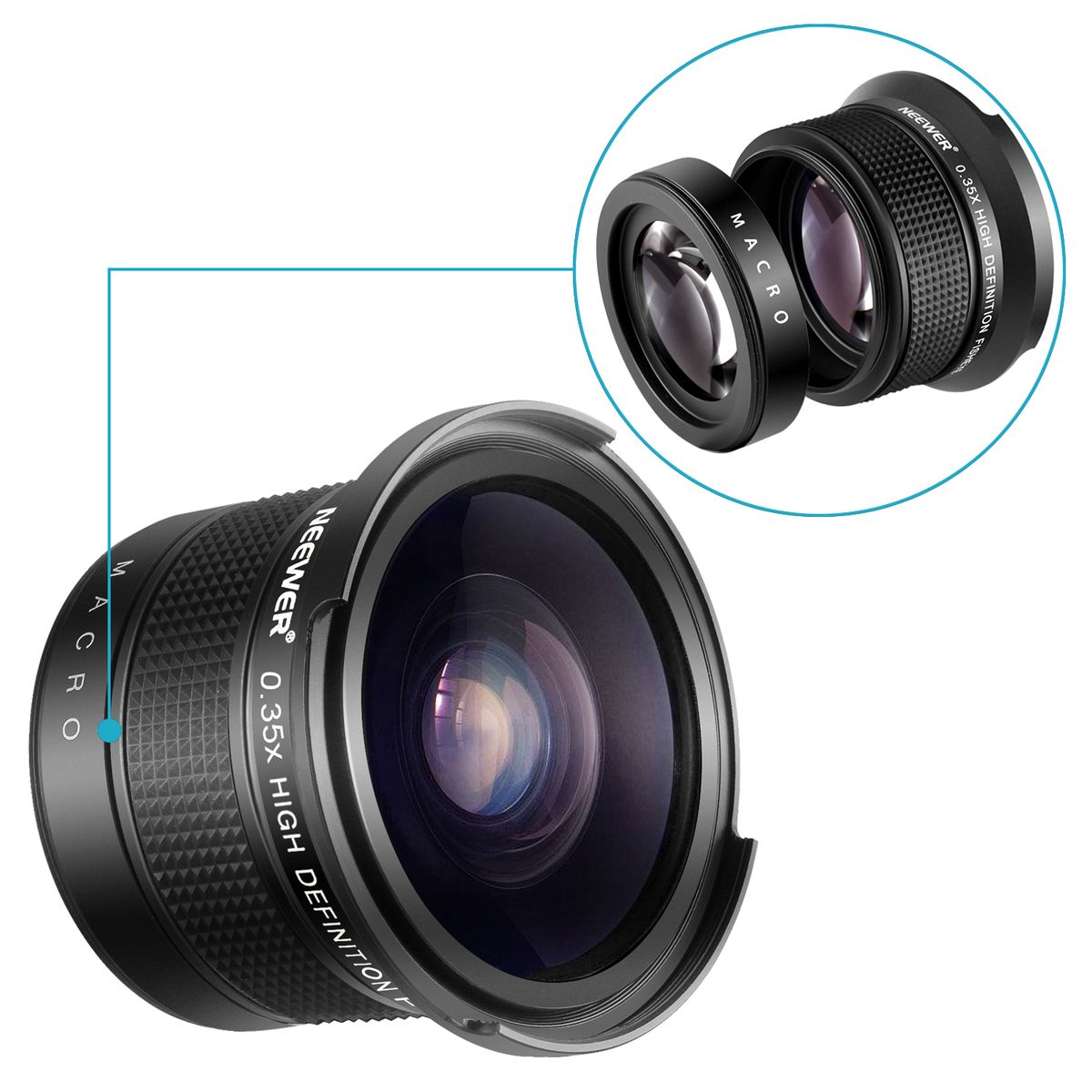 This 2-in-1 fisheye lens features a detachable macro lens for close-up, high-detail photography.