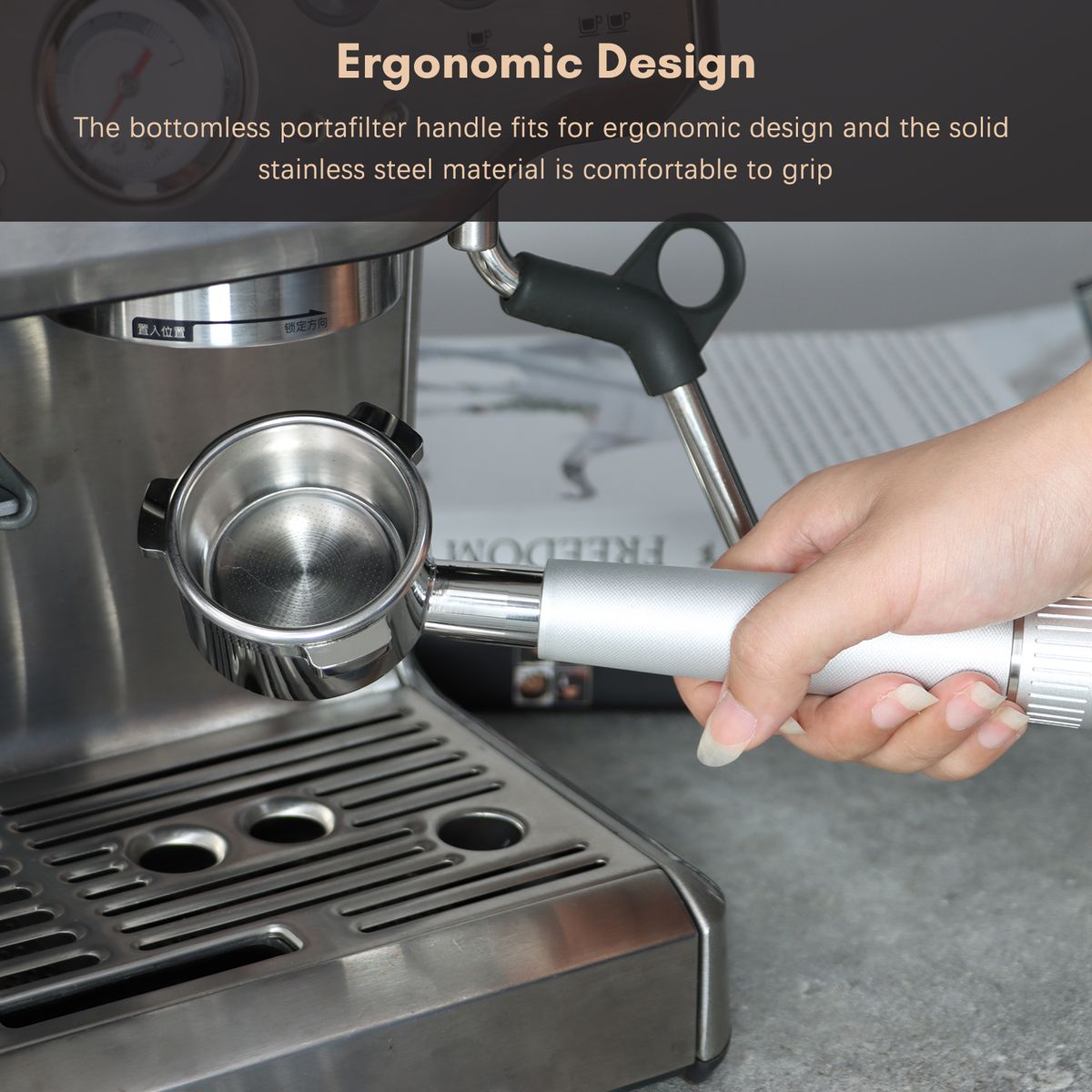 【Ergonomic Design】The bottomless portafilter handle fits for ergonomic design and the solid stainless steel material is comfortable to grip.