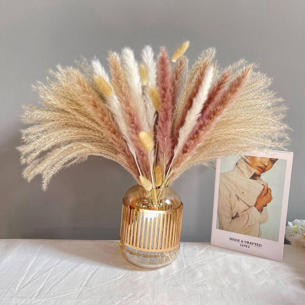Fits all kinds of vases: suitable for many styles of vases. 55 pieces can meet the needs of various caliber vases and more flower arrangements. Naturally dried pampas grass requires no daily care and pruning and is suitable for all seasons. Here you can feel the charm of nature.