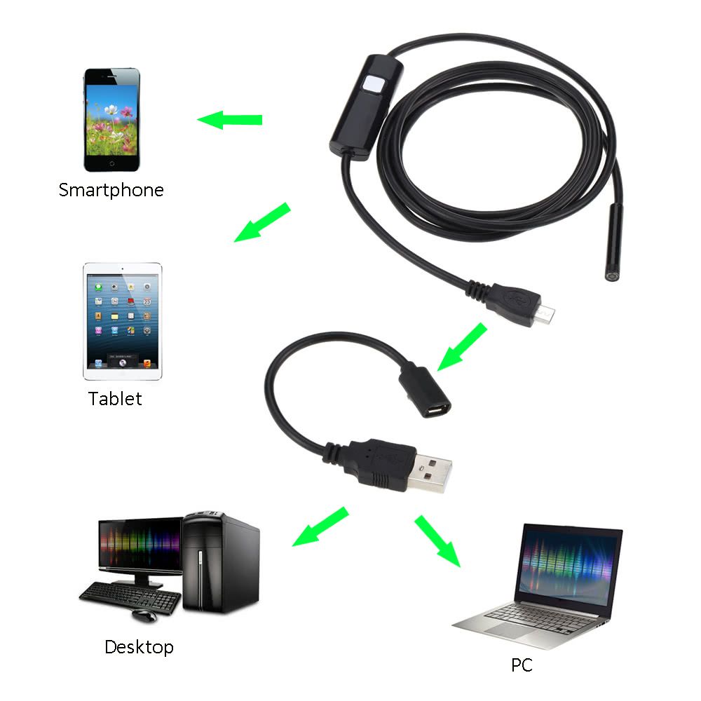 This is a very handy and practical device for your daily life especially when you want to see or find something that dropped in a small corner. It is perfect for auto repairs, finding and retrieving lost things down the drain via using the handy attachable hook. It is an indispensable tool to use in construction sites, workshops, laboratories, education, wildlife surveillance, car maintenance and repairing, hard-to-reach areas,etc. With an OTG adapter cable it is easy to connect with PC and phones(support OTG function).