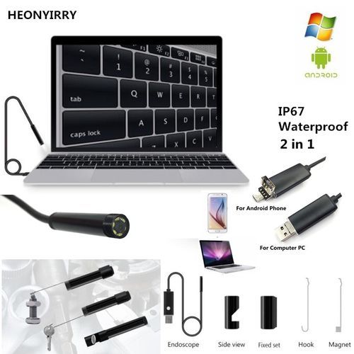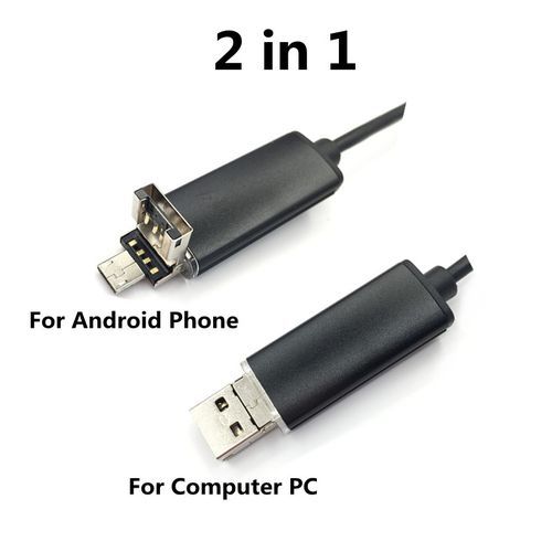 1m/2m 7MM 2-IN-1 Android PC HD Endoscope Waterproof Snake Borescope USB Inspection Camera For Android Phone/Computer PC Description: 2-IN-1 Design: the head combines 2 plug typs in one piece for Android 4.1 Phone & PC USB. This 2-In-1 inspection Eorescope professionally designed to help you see what you cannot see and touch. Built in 6LED to enable it to light up most of the unknow area, and act as your extra extended hands and eyes to make detection or surveying easier and more accessible. Mini, portable, easy to carry. (Just Support the phone with OTG and UVC) Wide Application: Surveying narrow gap, pipe, equipment detection, furnishing installation, underwater viewing, parts assembly, construction sites, workshops, laboratories, etc. Specification: 2 in 1 OTG & Micro USB Inspection Borescope Camera Lens Diameter: 7.0mm Resolution: 640*480(7.0mm) Sensor Size: 1/9 inch Frame Rate: 30fps View Angle: 67 degrees Waterproof: IP67 6 LED with Switch Button Length: 1m 2m 5m 10m Power Supply: 5V DC Via OTG USB Port Conputer Operating System: XP Win7 Win8 Vista Photo Format: JPEG Video Format: AVI Exposure Lamp: auto Operation Temperature: 0℃~70℃ Package Includes: 1 x Mini 2-IN-1 Endoscope 1 x Small pouch of accessories 1 x English Manual