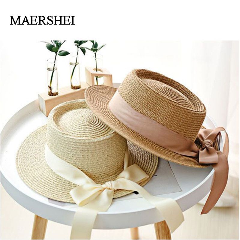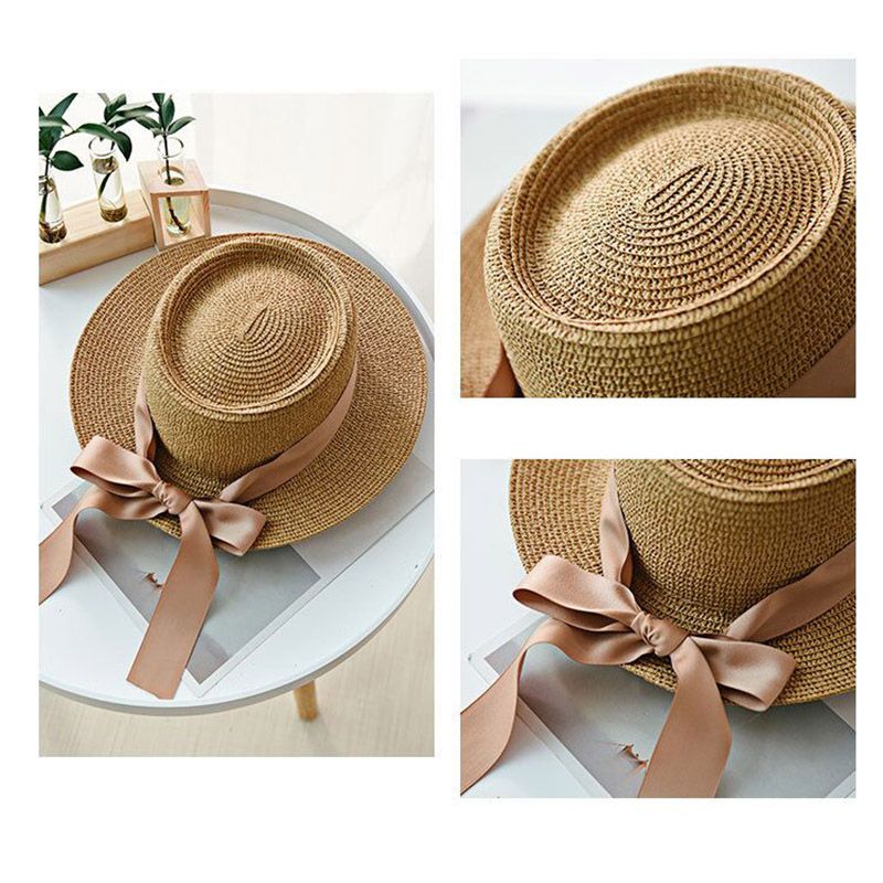 1X 2020 simple Summer Women's Beach Hat Female Casual Panama Hat Lady Brand Lady Flat brim Bowknot Straw cap girls Sun Hat