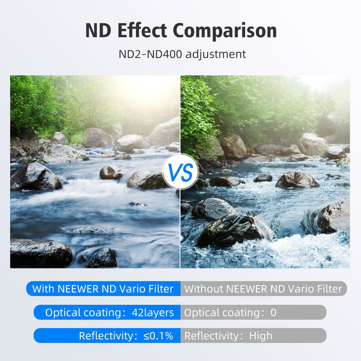 Made of quality optical glass, this variable ND filter with Japanese NITTO polarizing film and 42-layer coating has 9 adjustable settings from ND2 to ND400 to help you capture clear images when using longer exposures. Ideal for photographing rivers, waterfalls, streams, the sea, and fountains.
