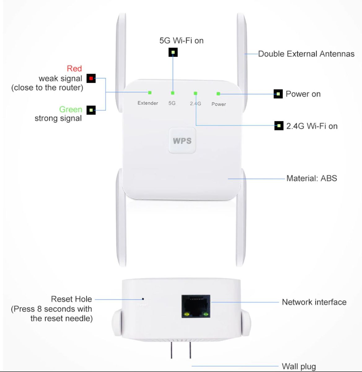 -Wireless high-speed access up to 1200Mbps.-Two external antennas for stable WiFi connectivity.-Link to 15 devices easily instead of 5 only.-Support Repeater and AP modes, support wireless and wired connectivity.-Universally complies with IEEE 802.11n, IEEE 802.11g and IEEE 802.11b standards.-Easy setup instruction provides quick & simple installation.-Elegant and compact appearance is sure to compliment your aesthetic.FEATURES-Transmission Speed: 1200Mbps-Transmission Range: Up to 2000FT Depends On the Environments-Chipset: Realtek RTL8196E-Antenna: 2* 2dBi External Antennas Fixed-Work Mode: Repeater /AP-Frequency Range: 2.4Ghz-5.8Ghz-Wireless Transmit Power: 20dBm MAX EIRP-Wireless Security: 64/128 bits WEP, WPA/WPA2, WPA-PSK/WPA2-PSK TKIP/AES-Extender Specification: 3.3*3.2*3in-Extender Weight: 126g/4.4oz