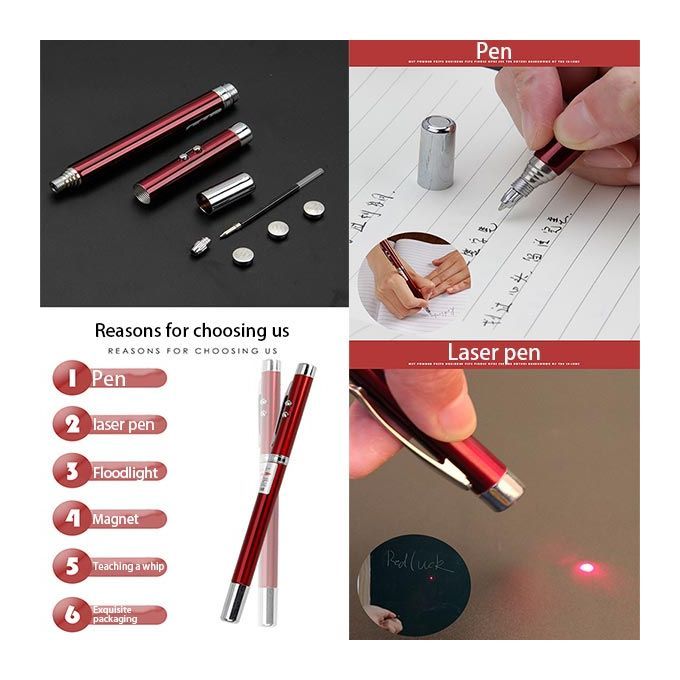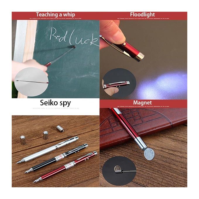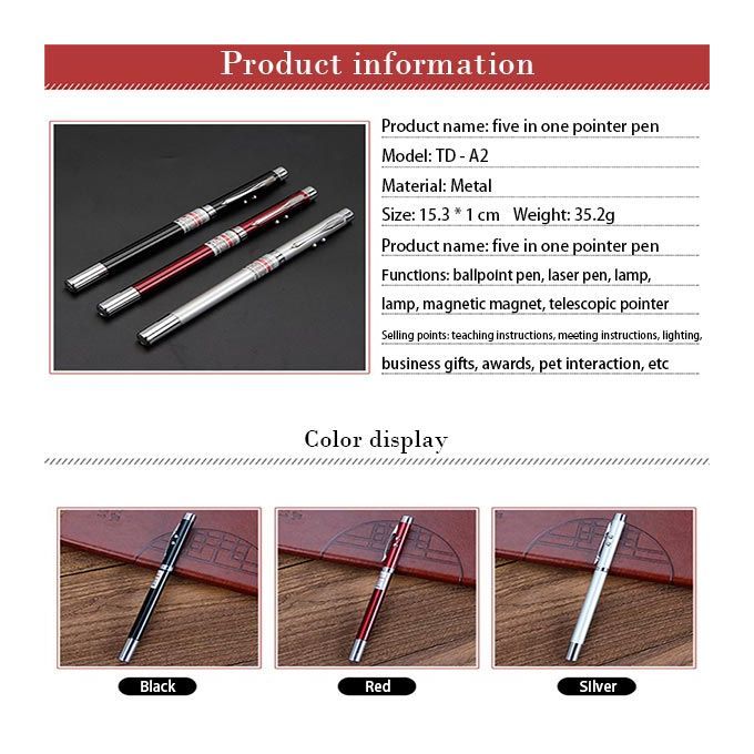 2. Multifunctional five-in-one laser pointer pen, ballpoint pen, LED light, infrared laser pointer, magnet and telescopic function.