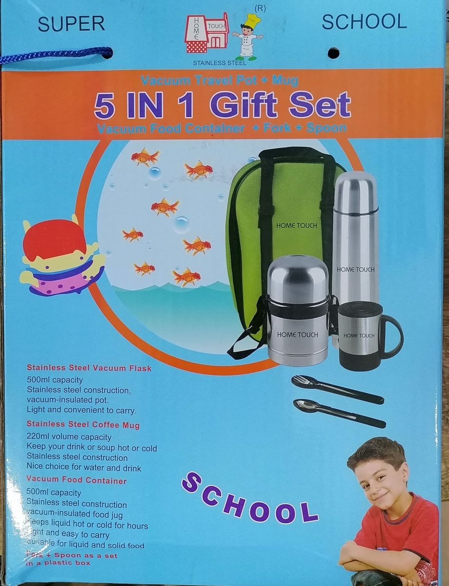 This Set of 5 gift pack is an ideal gift for grown up and kids alike when going to school, work or take along when on a road or field trip. the vacuum food container and flask keeps your beverage and food hot or cold as you desire and its stainless steel design makes it durable and easy to maintain and it also come with a carry bag for easy storage and movement.