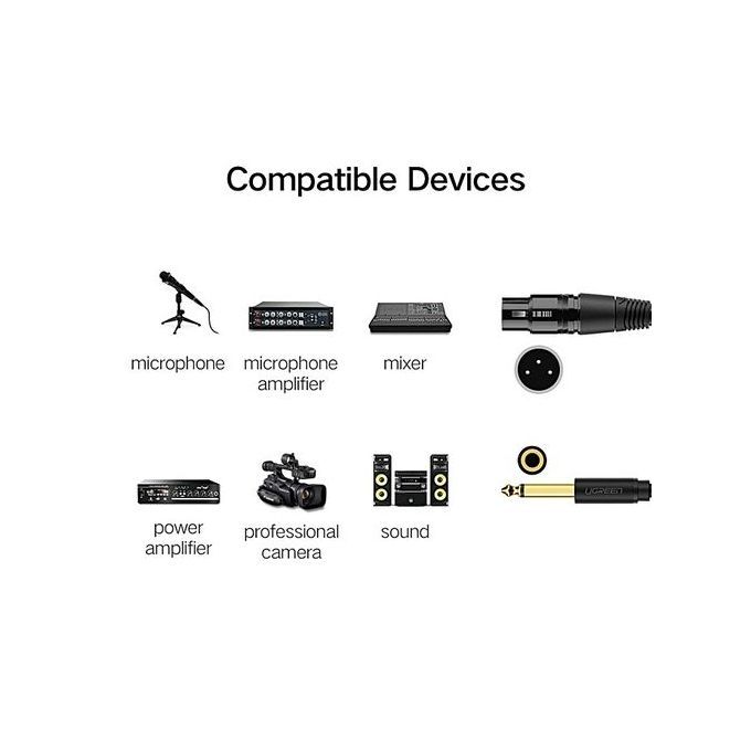 Description Ugreen 6.35mm Jack Mono to XLR Cable a sensible choice to connect your microphones to wide variety of applications.Such as professional recording studios, live performance, schools, churches,public speeches,parties and any other professional audio setups.With this XLR lead, you will definitely experience better audio effect, no matter in singing ,recording or speaking. Specifications -Connector : 6.35mm Jack Male and 3-pin XLR Female ,Gold Plated Connectors makes it durable for using ,improves anti-corrosion and anti-oxidant performance, thus extends the service life. -Conductor: Bare Oxygen-free copper (OFC). -Twin Conductive PVC Inner Shields -Cotton Yarn Wrap to reduce noise -98.5% Braided Shield -RoHS Compliant Application *Microphones-Audio Sound Consoles, *Microphones-Power Amplifier, *Microphones-Stereo System, *Microphones-Wireless Microphone Receiver *Microphones-Professional Camera