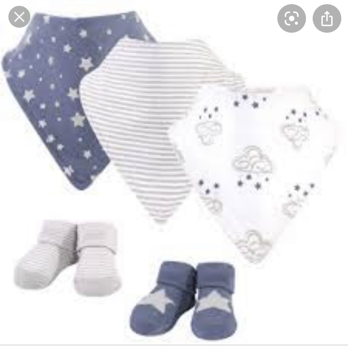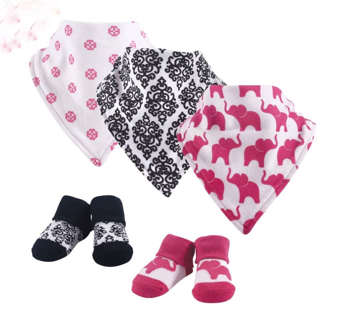 Yoga Sprout's 5-Piece Bandana Bibs & Socks Set are an adorable set for moms looking for fashionable matching bandana bibs and socks and a great baby shower gift. Each set features three bandana bibs and two pairs of socks. Bibs made of cotton-poly blend and socks made of cotton, nylon and spandex. Each set features coordinated prints and patterns. Ideal for ages 0 months to 9 months. Available in Pakistan at your doorstep through cash on delivery/bank transfer via mayascloset.pk.