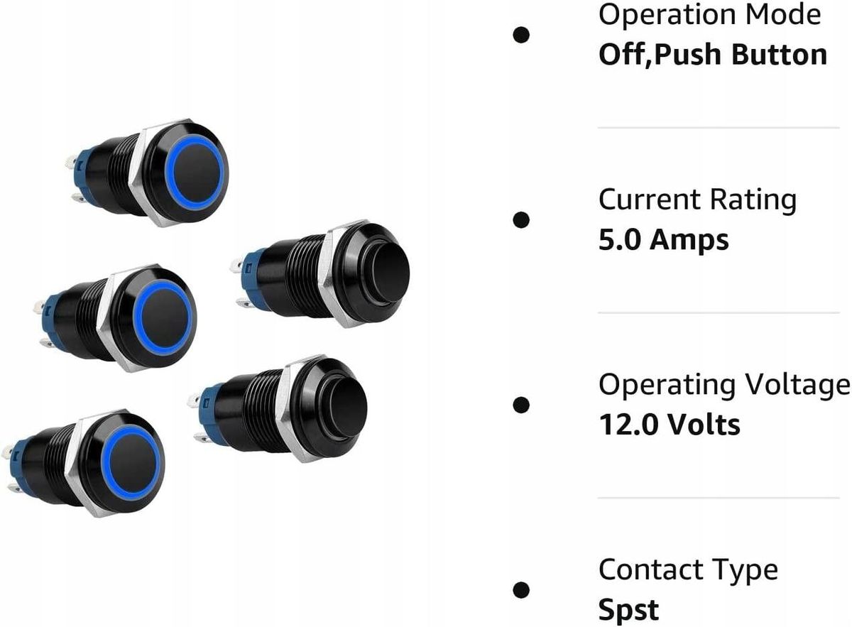 1. [NEW PUSH BUTTON SWITCH] Rating: 5A 12V DC; Mounting Hole Size: 0.5 inches (12 mm); Operation Type: Latch; Push In, Open; Push Back, Close. Contact Configuration: 1NO 1NC. IP65 waterproof protection for use in wet or dusty environments.