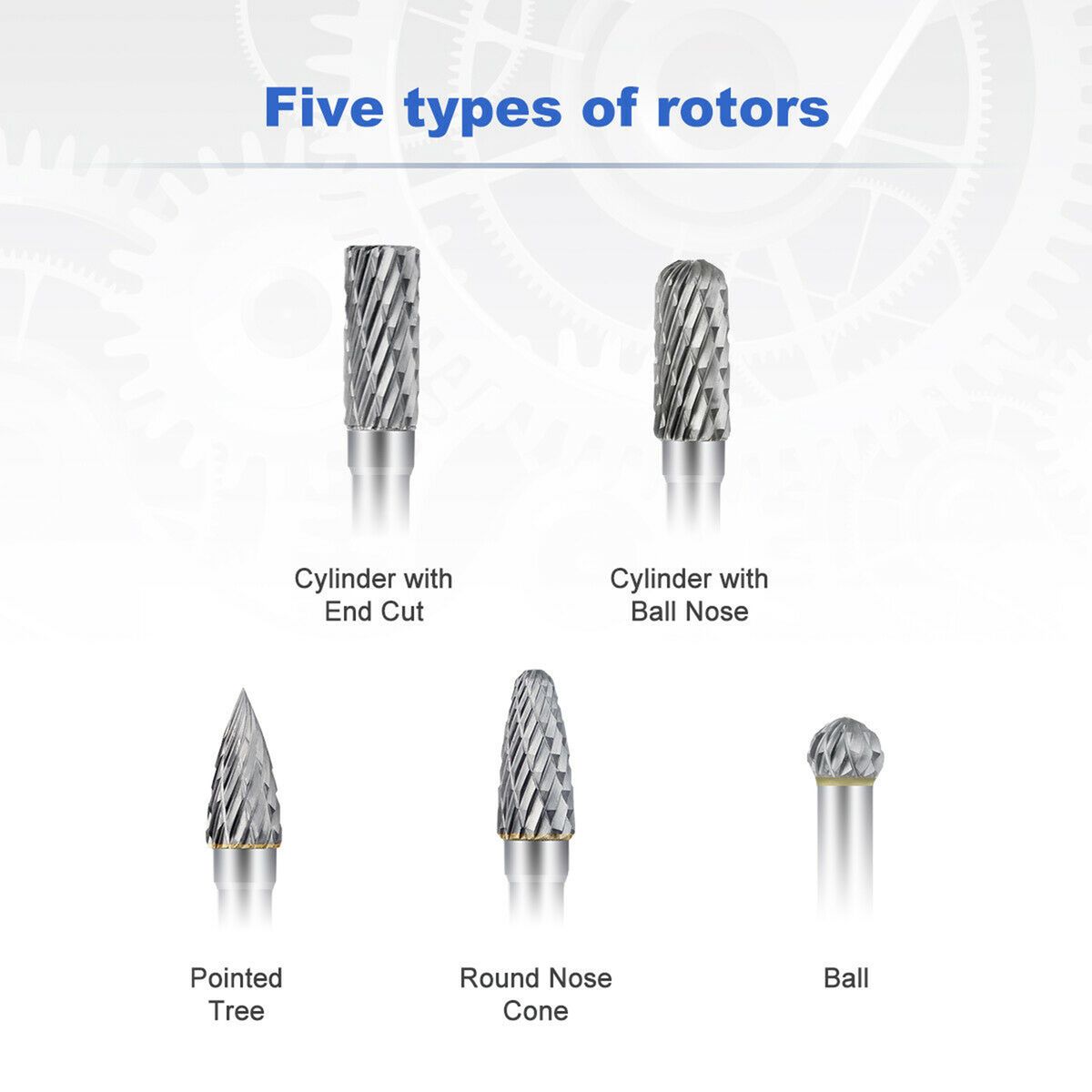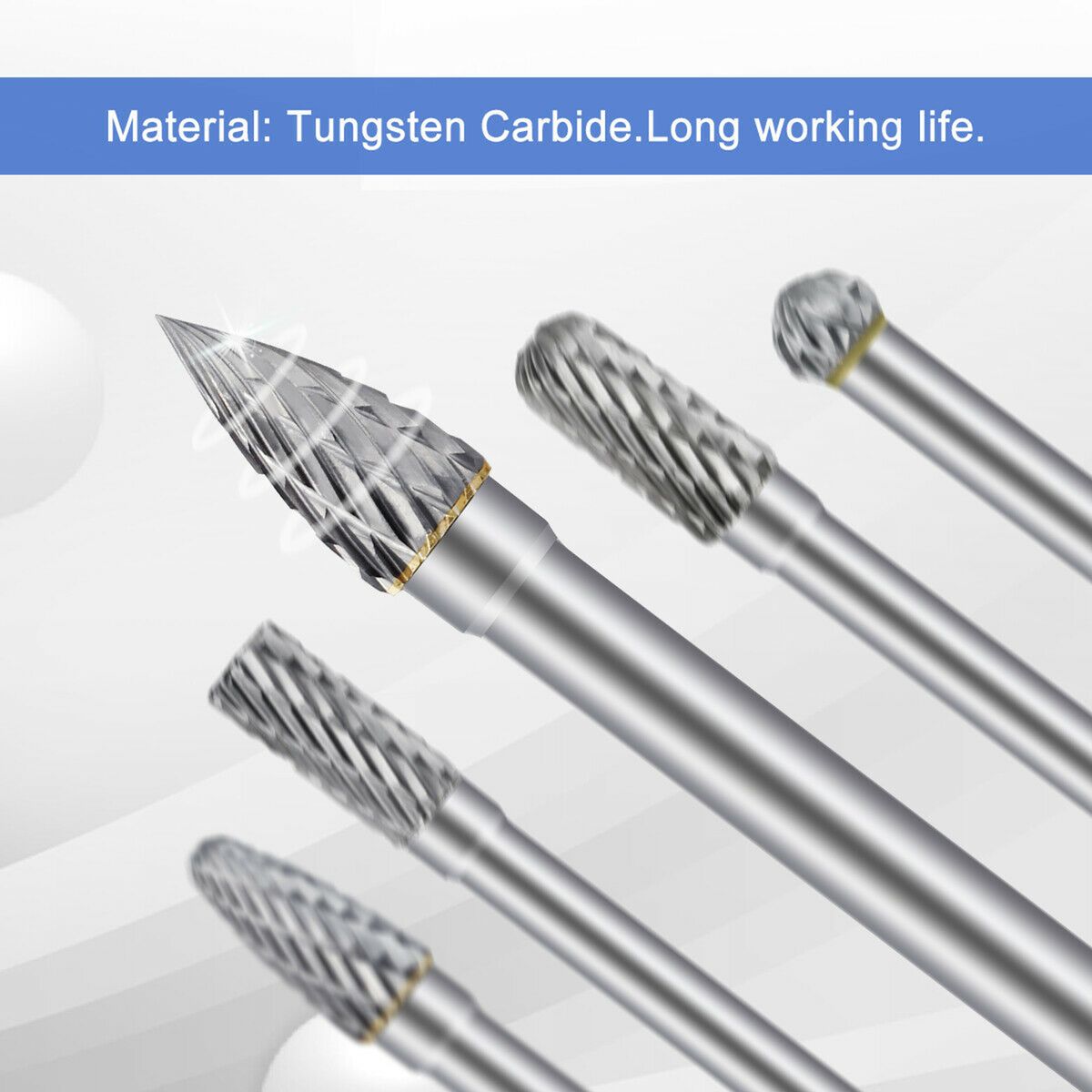 5Pcs carbide burrs set, double cut head, quick cuts. It is easy to use, perfect for woodworking and engraving.