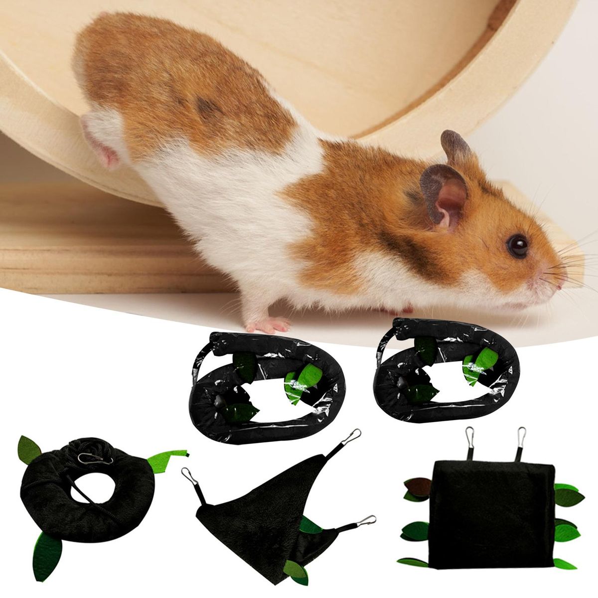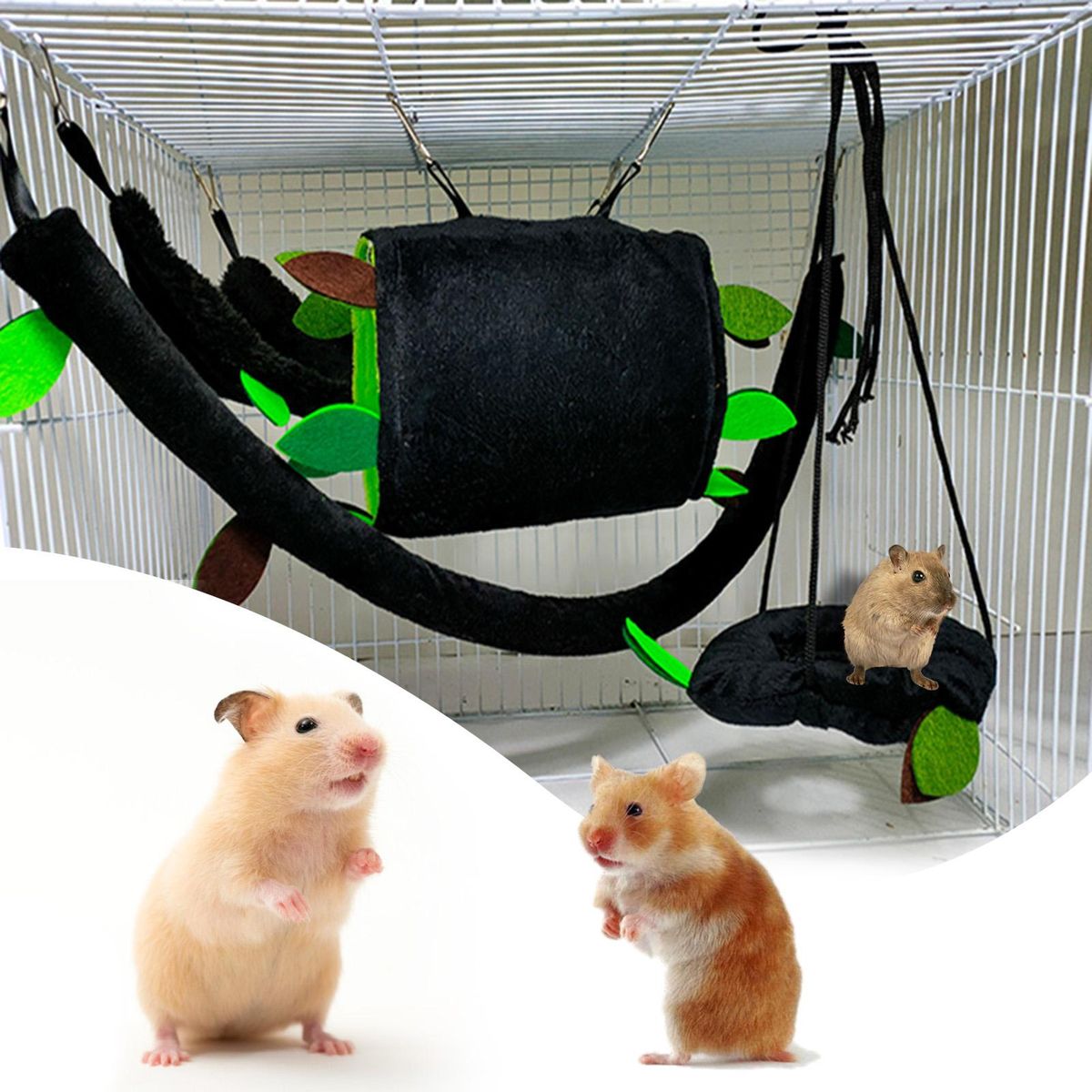 There is atube, cableway, triangle hammock and round swing included in this pet kennel, it also comes with vivid leaf decoration, which is exquisitely made and attractive, durable.