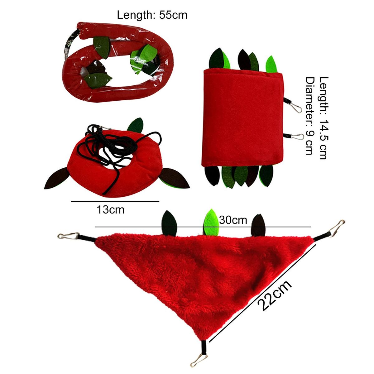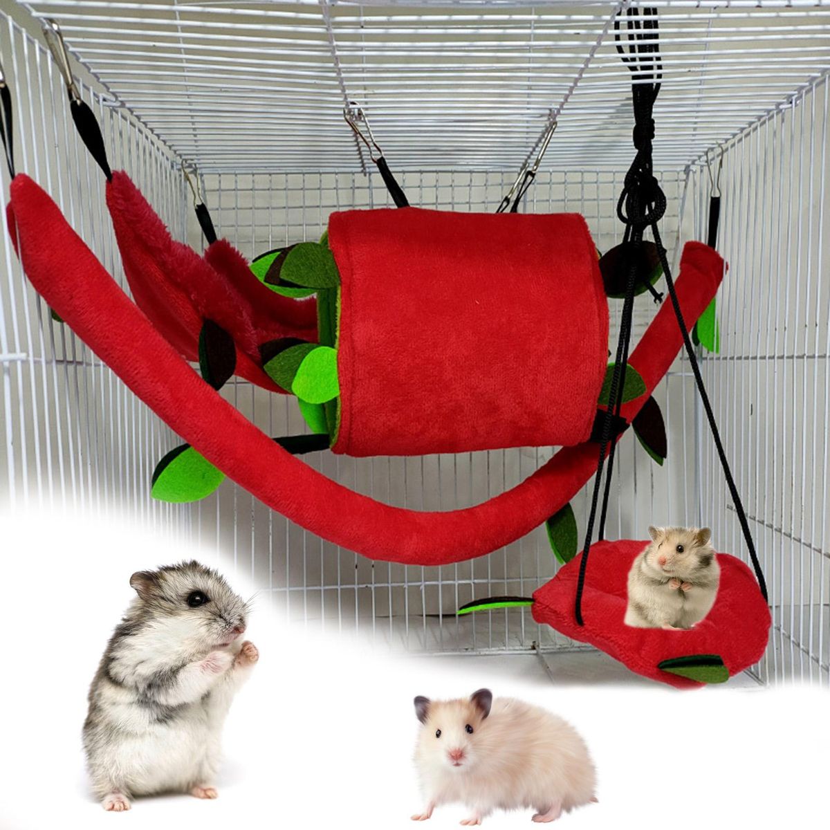 There is atube, cableway, triangle hammock and round swing included in this pet kennel, it also comes with vivid leaf decoration, which is exquisitely made and attractive, durable.