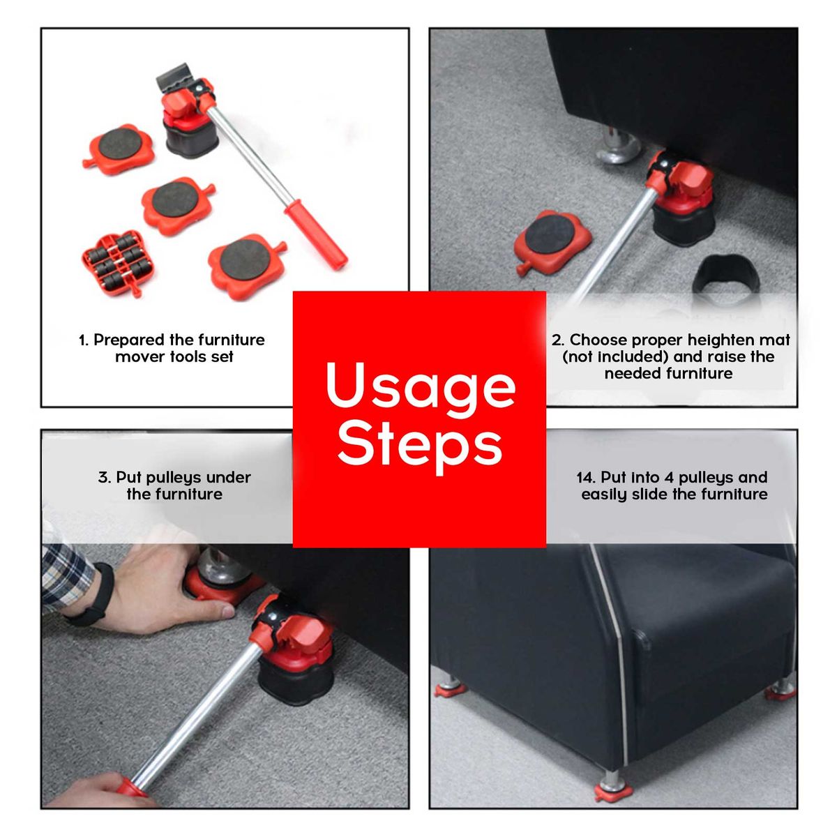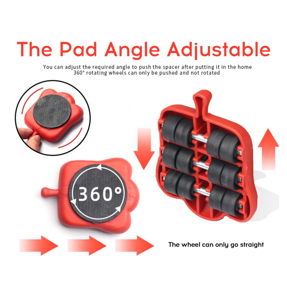 The lifter and 4pcs pulleys are practical for heavy furniture carrying, making the handling process more labor-saving. Ergonomical handle, the rocker supports are raised and supported at a right angle of 90 deg; to stop shedding. The pulley is angle adjustable 360 degrees, can only go straight.
