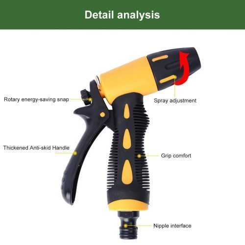 1.Can quickly and easily to give a clean car, save time, money and energy.2.You can adjust the S pray shape by revolving the nozzle.3.A comfortable handle, easy to use and won't make you feel tired.4.No need to keep squeezing the trigger during S praying, helps reduce fatigue after longer use.5.Perfect for motor vehicles cleaning, garden irrigation and animal cleaning, etc.
