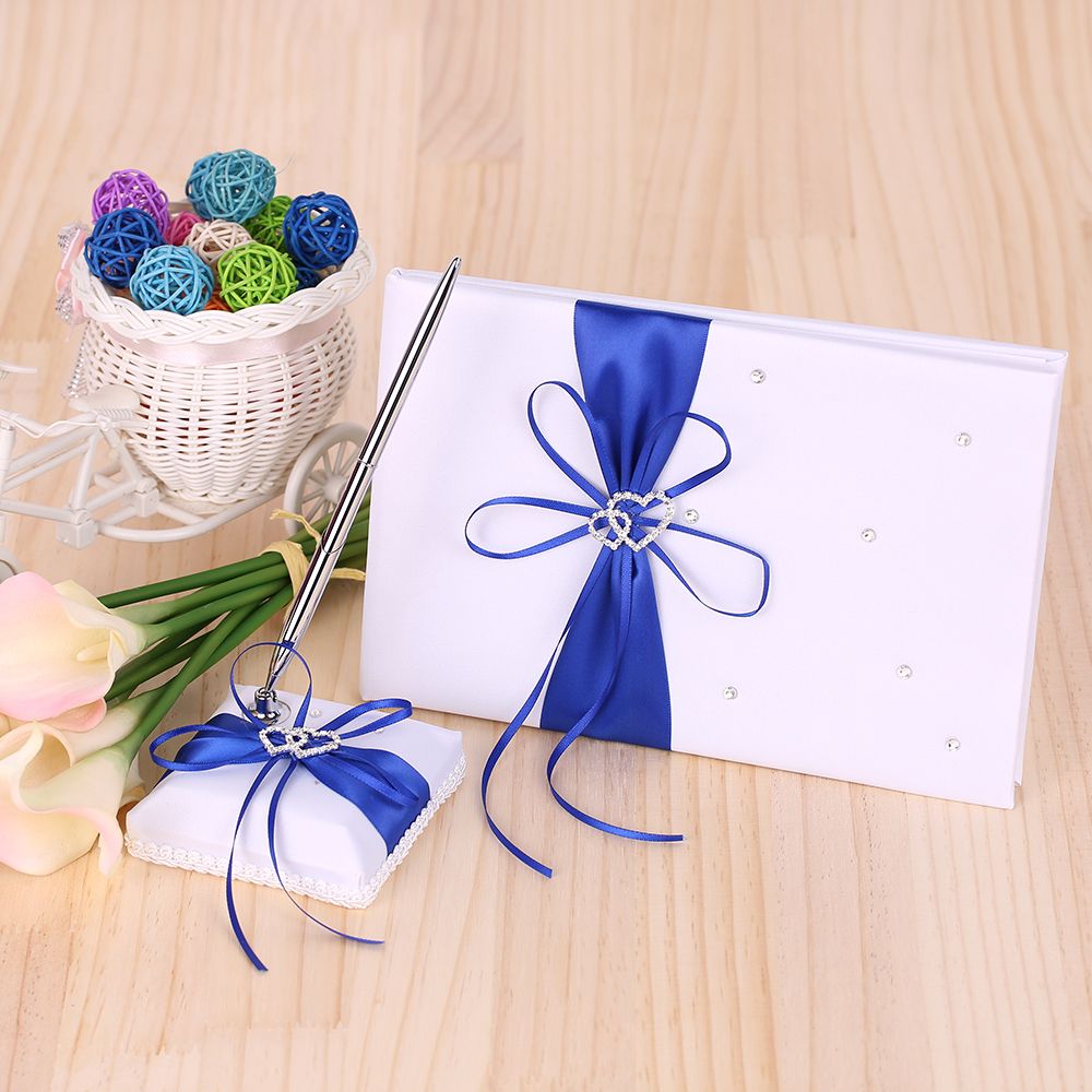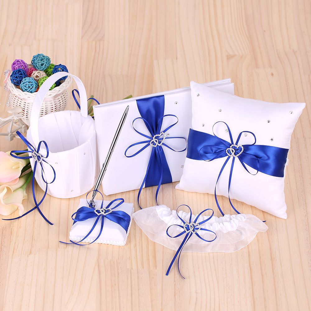 Set includes 5pcs necessary wedding supplies: Flower Girl Basket + 7 * 7 inches Ring Bearer Pillow + Guest Book + Pen Holder + Garter. Double heart design, smooth silk satin face with rhinestones and faux beads dotted. Beautiful and elegant, perfect for your wedding!