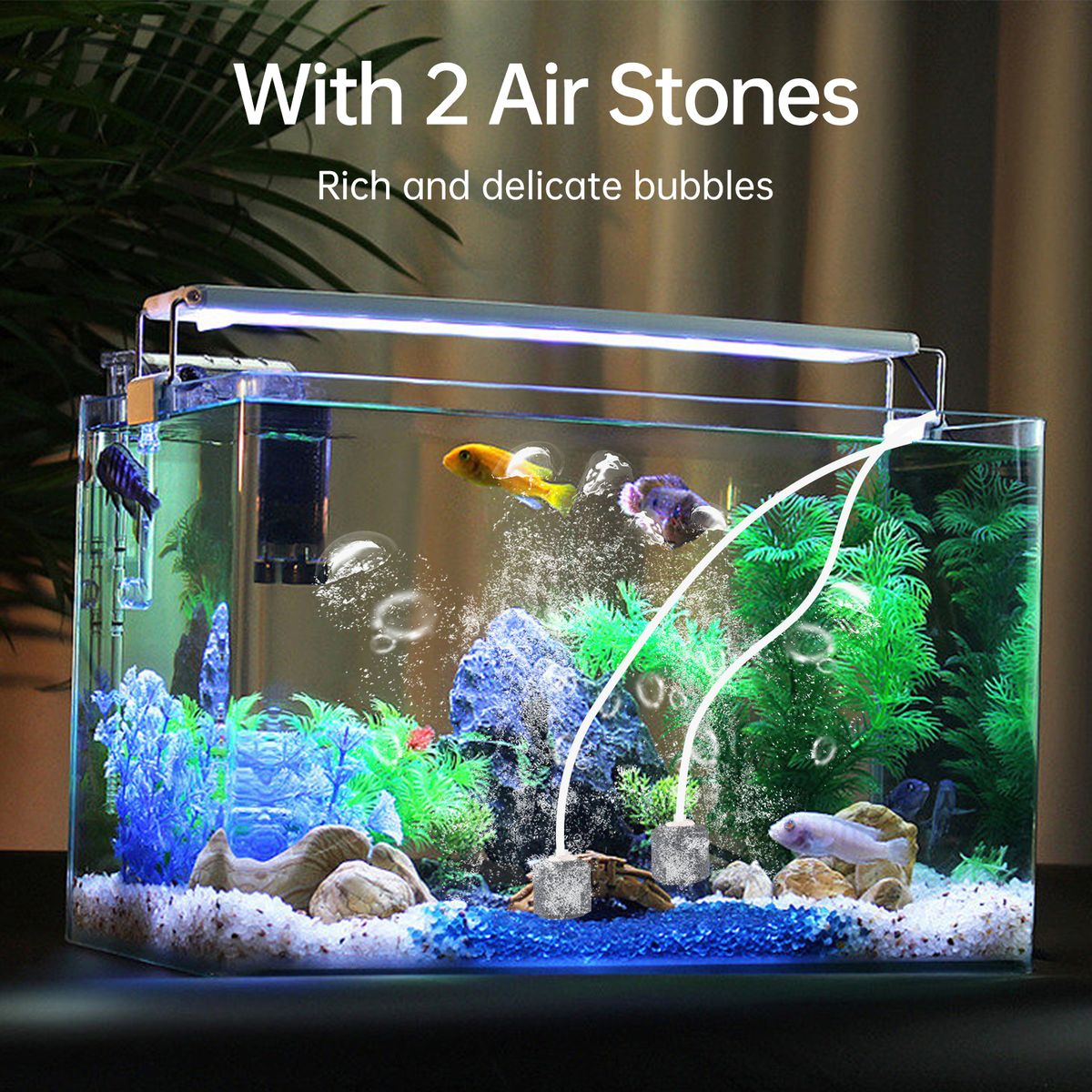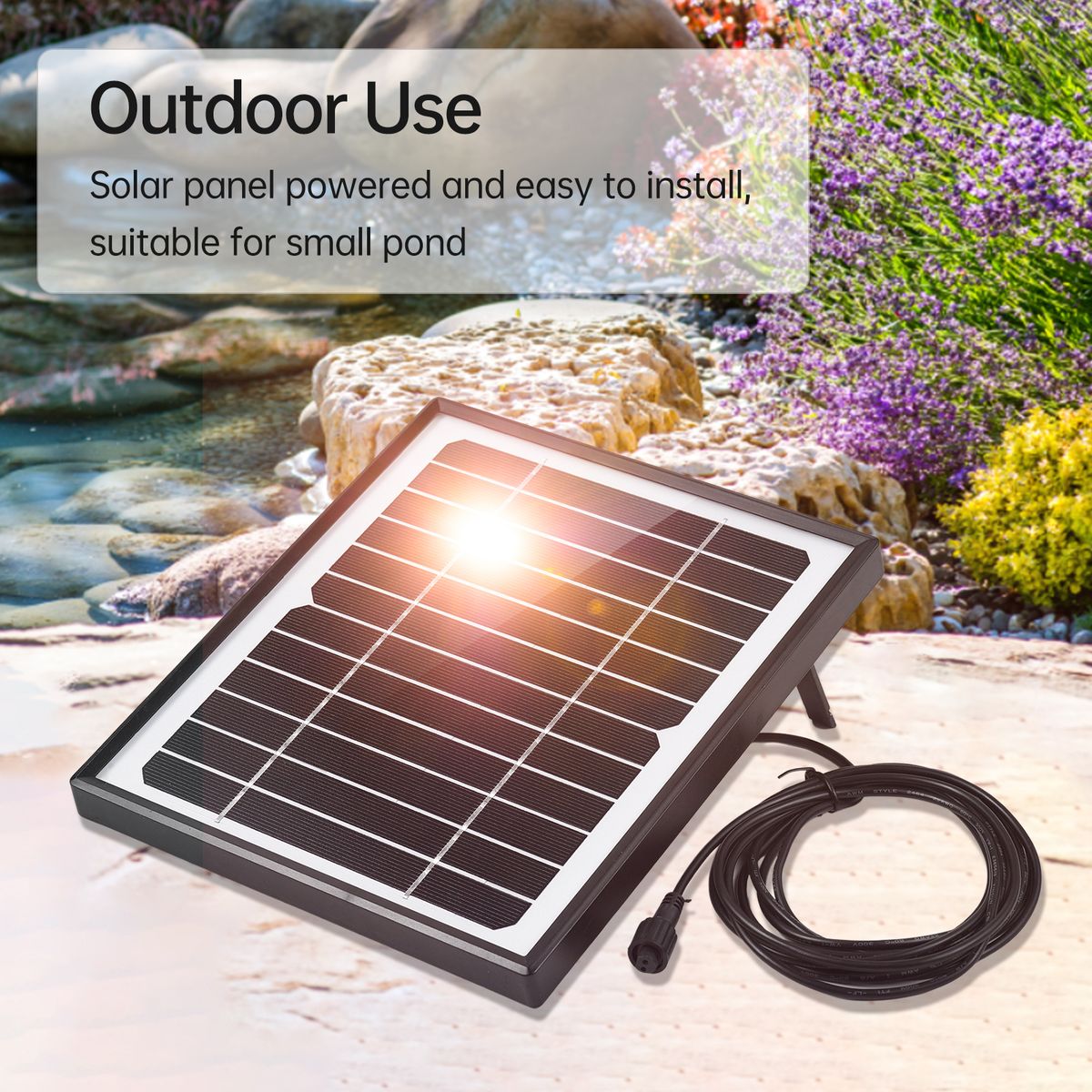 【With 2 Air Bubble Stones】With 2 air bubble stones, the solar air pump can increase oxygen level of the fish pond quickly, keep pond clean and keep fish more active.