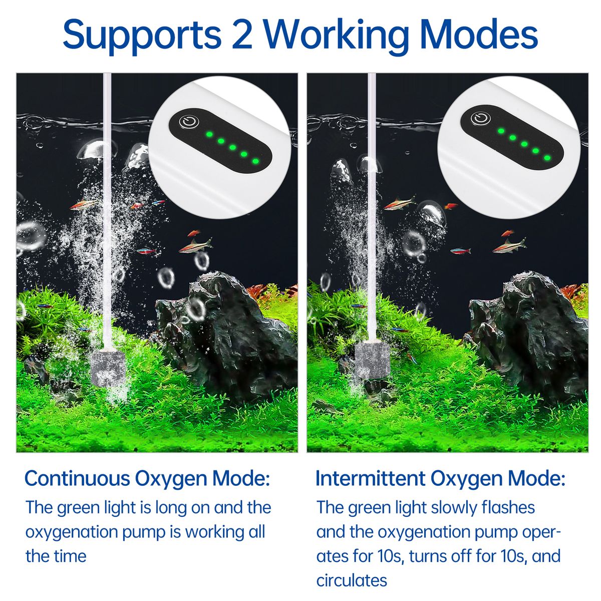 【Supports 2 Working Modes】Continuous Oxygen Mode-- long press the button for 2s to start, the air pump will automatically enters continuous oxygen mode, the green light is long on; Intermittent Oxygen Mode-- short press the button to switch to intermittent mode(work 10s and stop 10s), the green light slowly flashes.