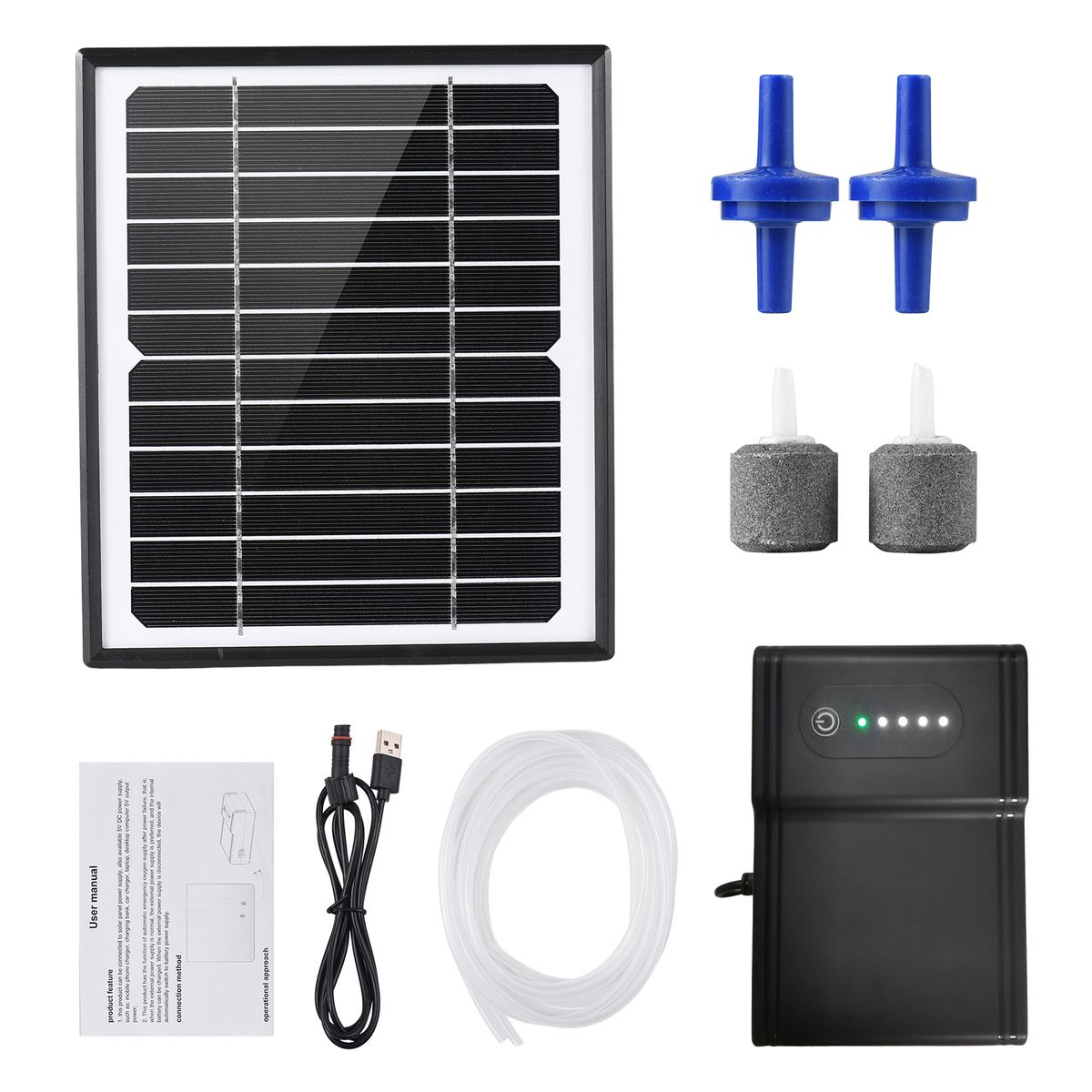 1 x Solar Panel,1 x Air Pump,2 x Oxygen Pipe,2 x Air Stones,2 x Check Valve,1 x USB Cable,1 x Users Manual(English & Chinese)